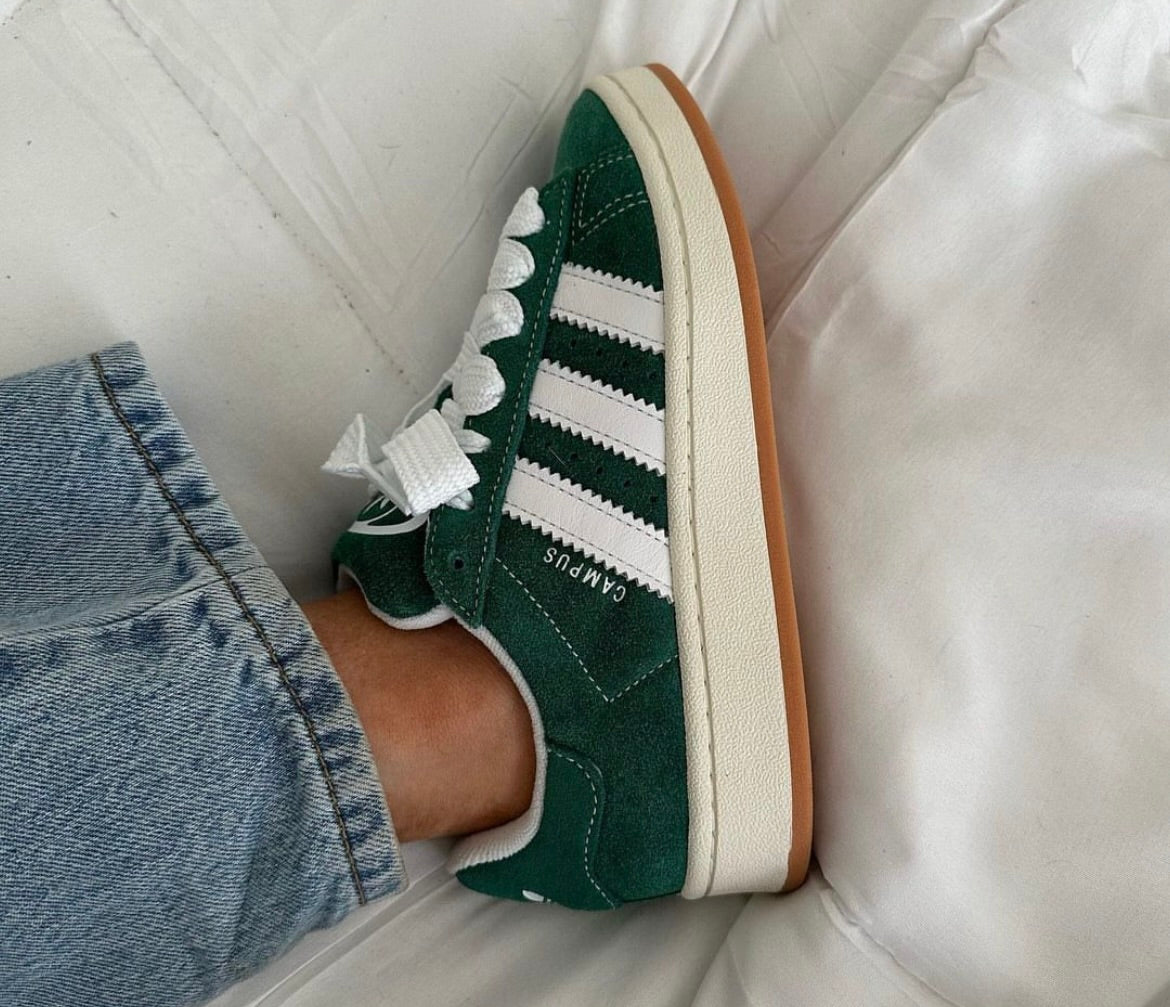 The adidas Campus 00s ‘Dark Green Gum’ updates the heritage silhouette with a makeover. Extra-wide laces secure the green upper, accented with contrast stitching and oversized white three-stripes. adidas Trefoil branding decorates the tongue and heel. The midsole features stitched sidewall construction and a vintage off-white finish.