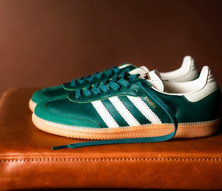 For those who set trends rather than follow them, the Samba OG are a must-have. Originally made for indoor football, they have long transcended their sporty beginnings. The 'Collegiate Green Gum' feature a leather upper with nubuck overlay. Gold accents and signature 3-Stripes on the side give a subtle nod to adidas heritage.