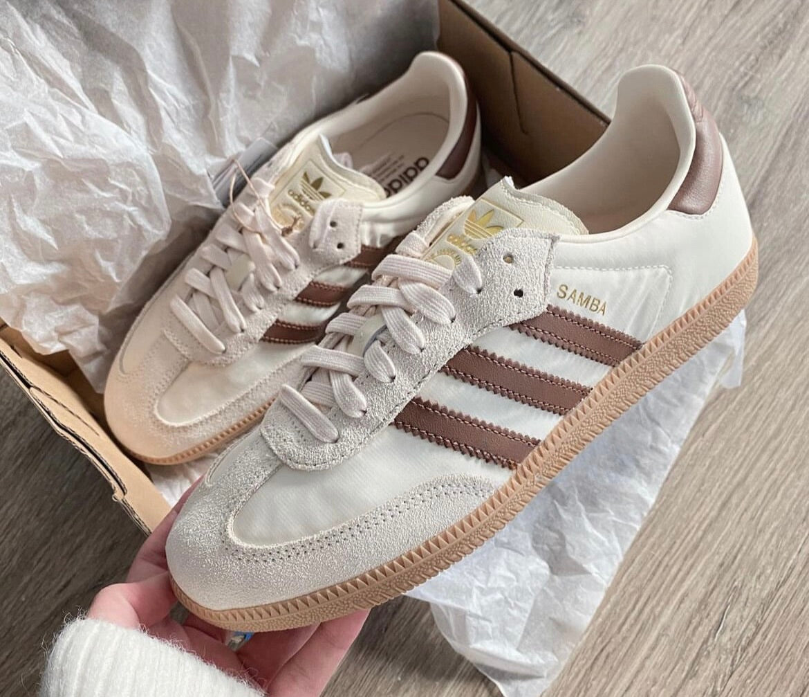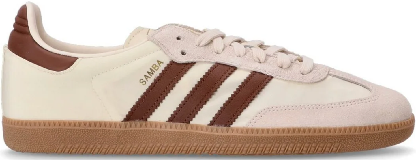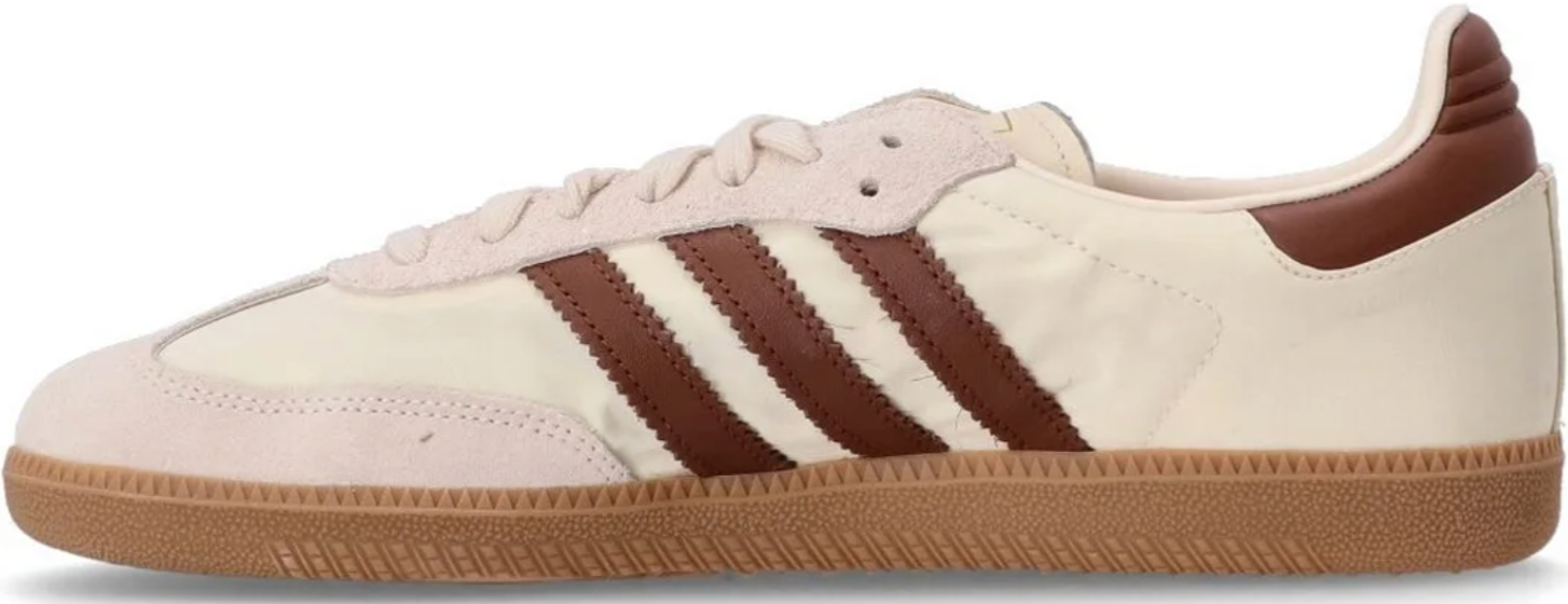 A timeless classic that straddles decades and lifestyles. From football pitches to skate parks, the adidas Samba OG 'Cream Brown' features lightweight nylon in a cream hue, paired with a suede t-toe and eyestay, as well as leather stripes and heel tab in brown. A nod to the 70s archive olympic kit bags, the pair offers breathability and comfort.