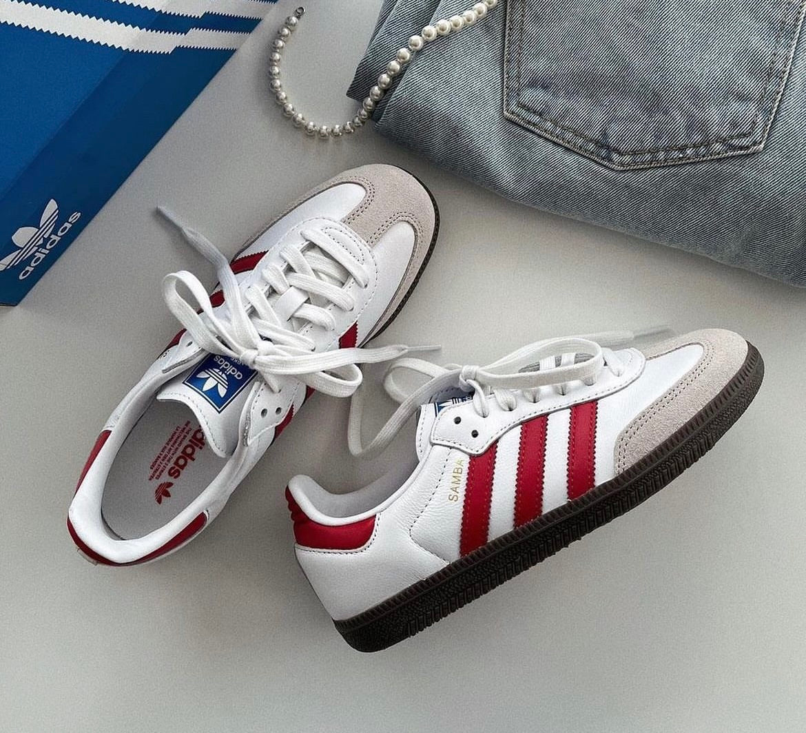 The Adidas Samba sneaker was first designed in 1949 to enable football players to train on icy grounds, since expanding to the new Samba OG. A timeless icon that merges street and sporty style. Made with the same leather uppers as the original, the brand's iconic 3-Stripe branding takes place in scarlet, with a heel to match.