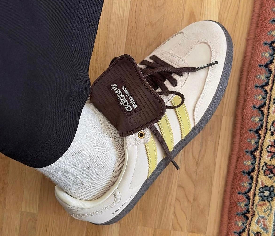 The Wales Bonner x adidas Samba ‘Ecrtin Brown’ is taken from a capsule collection centered around Jamaican sport style. Wales Bonner’s take on the silhouette features a tan nubuck upper with yellow three-stripes and deco stitching at the heel. Dual branding appears on the tongue, while ‘Wales Bonner’ is inscribed on the lateral.