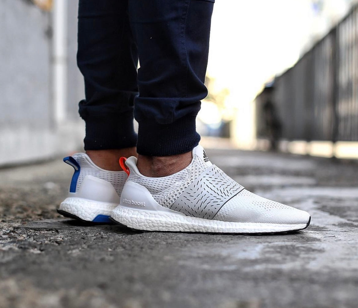 As part of adidas' 2016 consortium world tour, Wood Wood's Ultra Boost 1.0 pays tribute to the detection of gravitational waves in the afterglow of the Big Bang. The source of inspiration for the design is scientist's first visual depiction of the waves – a chart showing lines intersected by shaded areas of orange and blue.