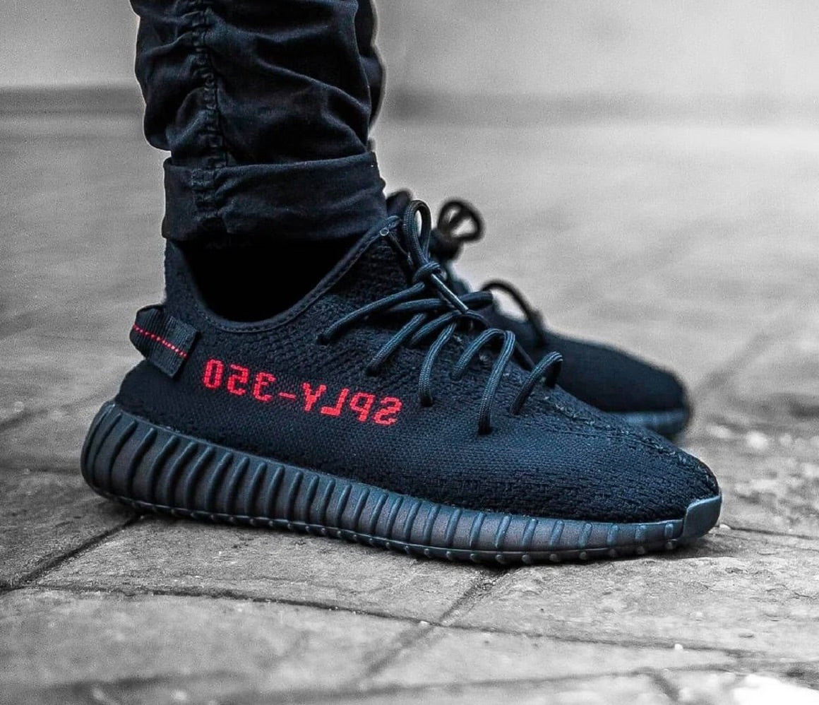 The Yeezy 350 'Bred' delivers a black primeknit upper accented with a pronounced centre seam and red SPLY-350 branding on the lateral quarter panel. A pull tab at the heel features crimson embroidered detailing. The lightweight build is mounted on a full-length boost midsole, wrapped in semi-translucent black rubber for added durability.