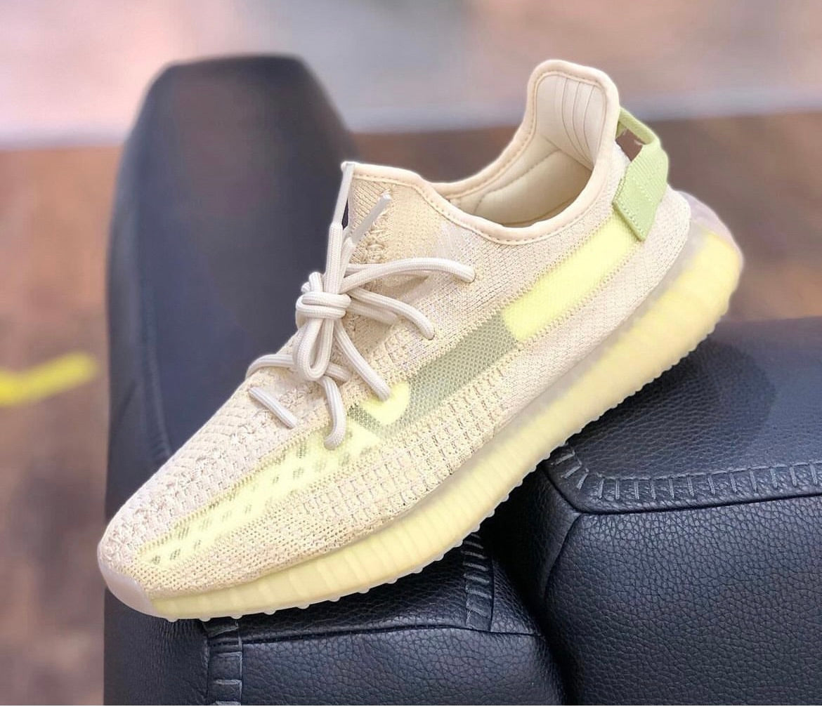 The Yeezy 350 ‘Flax’ features a breathable primeknit upper in a subtle wheat hue, complemented by tonal rope laces and a post-dyed monofilament side stripe tinted in a muted yellow finish. The lightweight knit build rides on a full length boost midsole, partially visible beneath a semi-translucent rubber cage which features ridged detailing.