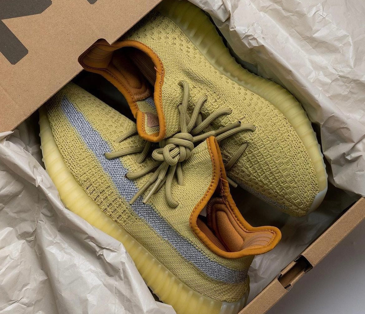 The Yeezy Boost 350 'Marsh' makes use of a primeknit upper in a shade of yellow. A dark mustard yellow is then applied to the elastic collar, while the pairs signature post-dyed monofilament side stripe is rendered with light grey fibers. The semi-translucent rubber outsole is similarly tinted yellow and full-length boost unit for responsive cushioning.