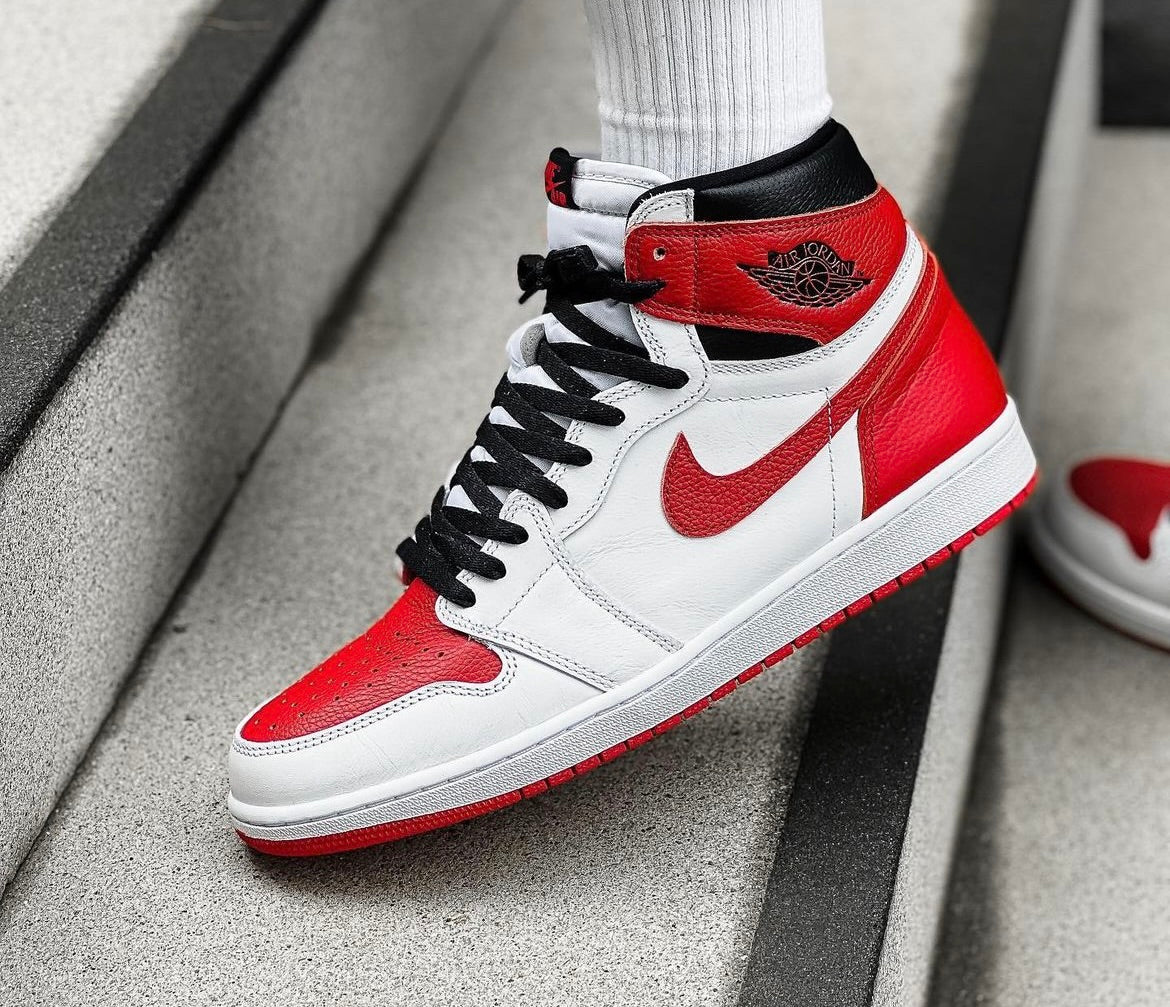 The AJ1 High ‘Heritage’ features white leather uppers, with contrasting hits of red on the toe, swoosh, heel, and ankle. The latter is stamped with a retro wings logo in black, matching the laces and collar. Nike branding decorates the tongue tag, while this pair sits atop a rubber cupsole with cushioning in the heel.