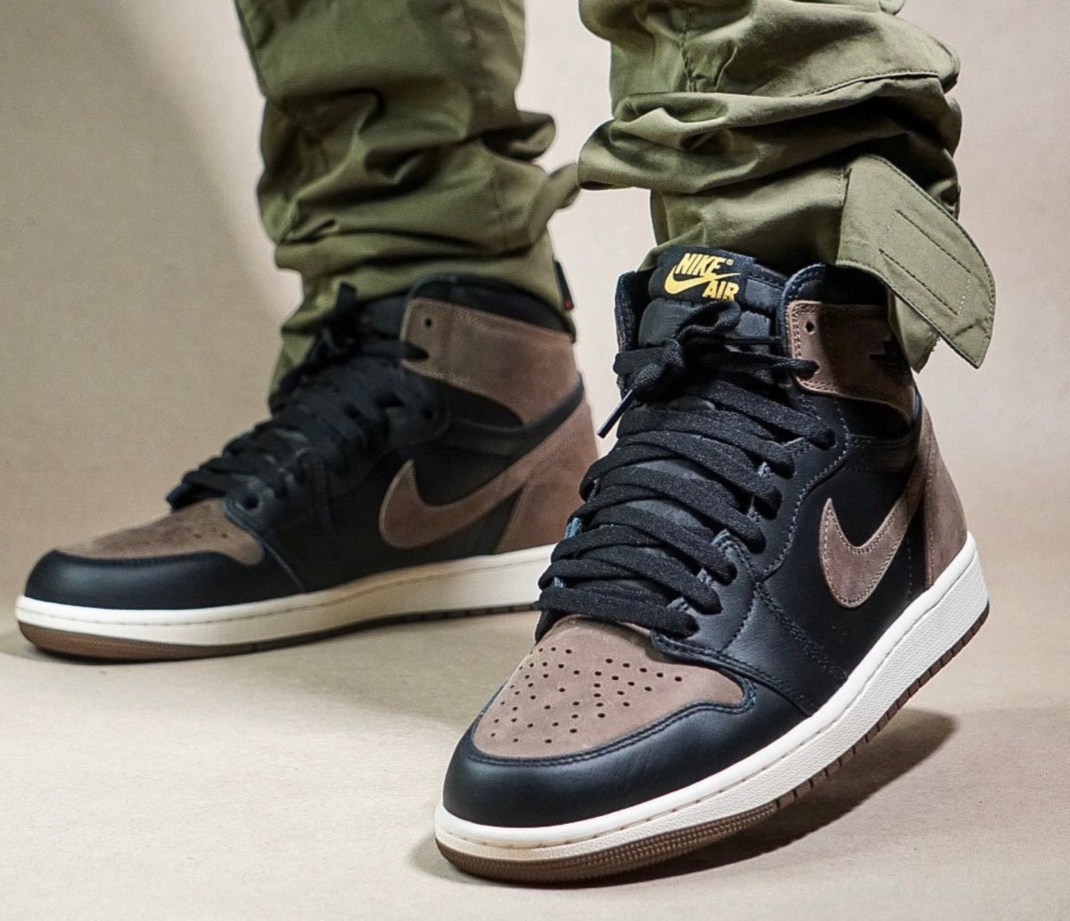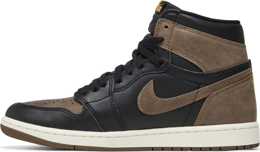 The AJ1 High ‘Palomino’ merges a luxe build with OG-inspired two-tone colour blocking. It carries a black leather upper, accented with aged brown nubuck on the toe box, swoosh, heel overlay and collar flap. The latter is marked with a black wings logo on the lateral side, while the tongue tag displays a Nike logo with metallic gold lettering.