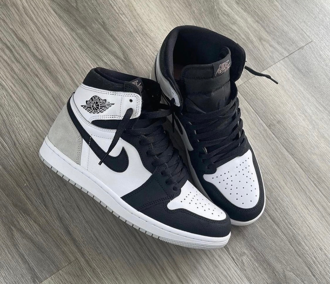 The AJ1 High 'Stage Haze' combines a white leather base with a grey suede heel overlay and a forefoot overlay in cracked black leather. Matching black accents are featured on the signature swoosh and a retro wings logo stamped on the lateral ankle. Nike branding is outlined in bleached coral on the woven tongue tag.