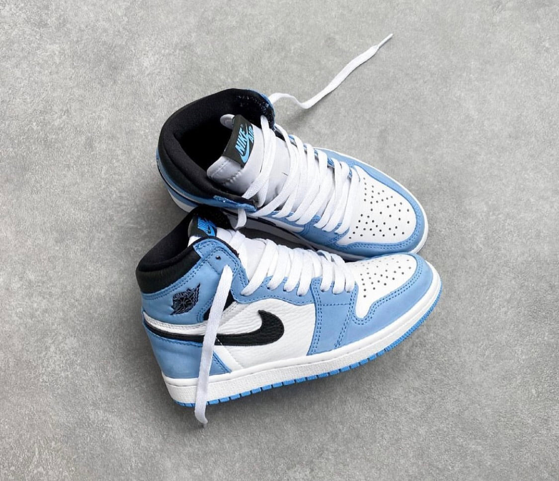 Paying tribute to MJ's college, the AJ1 High 'University Blue' features a University of North Carolina look. Built with leather, the upper appears in a mix of white and blue, contrasted by black on the swoosh, collar, laces and wings logo. Underfoot, the midsole gives way to a concentric outsole with a brighter shade of blue.