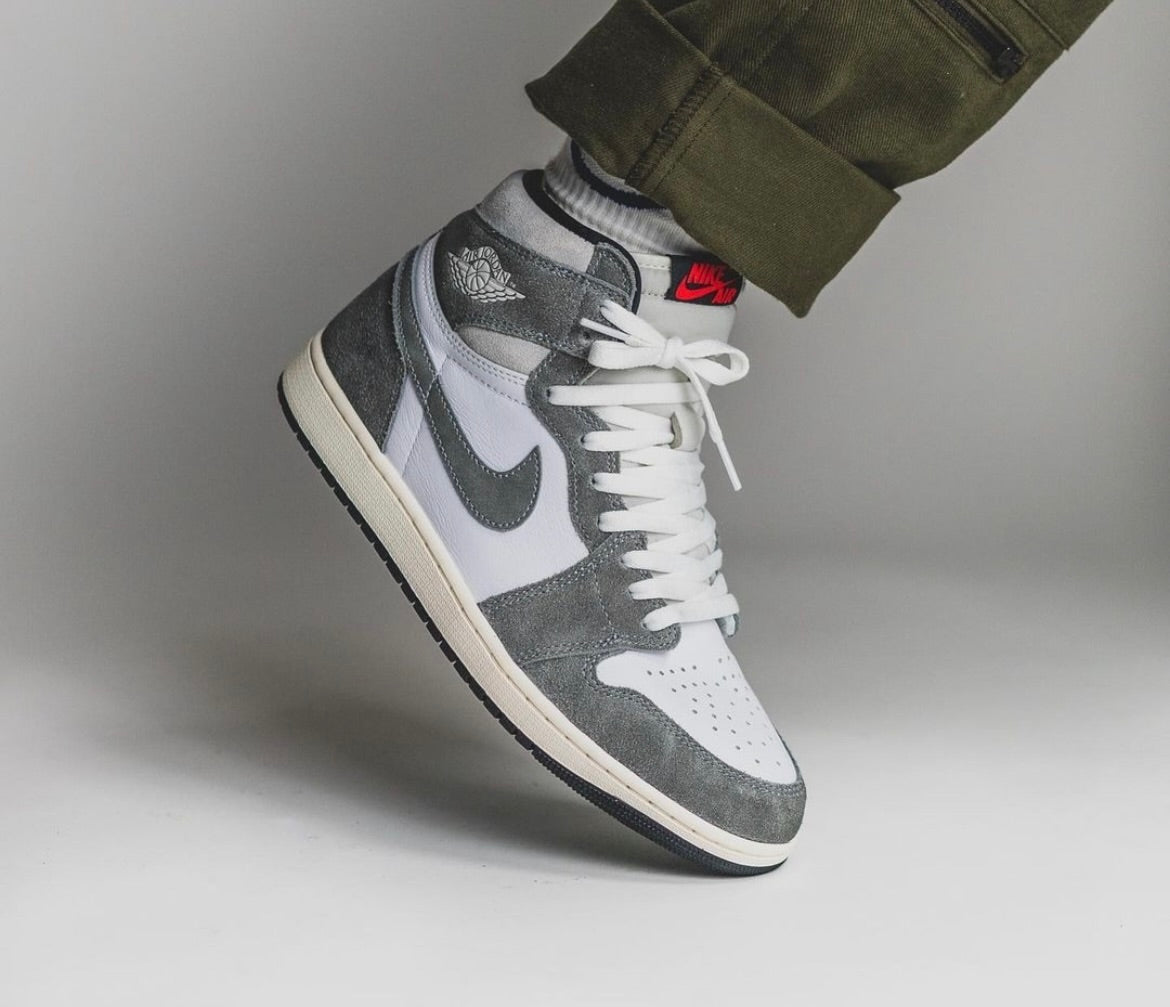 The AJ1 High ‘Washed Black’ dons a white leather upper with grey suede overlays and a matching swoosh. A lighter shade of grey suede is utilised on the collar, with the same colour ankle flap marked with the wings logo. Underpinning the sneaker is a vintage off-white midsole, supported underfoot by a grippy black rubber outsole.