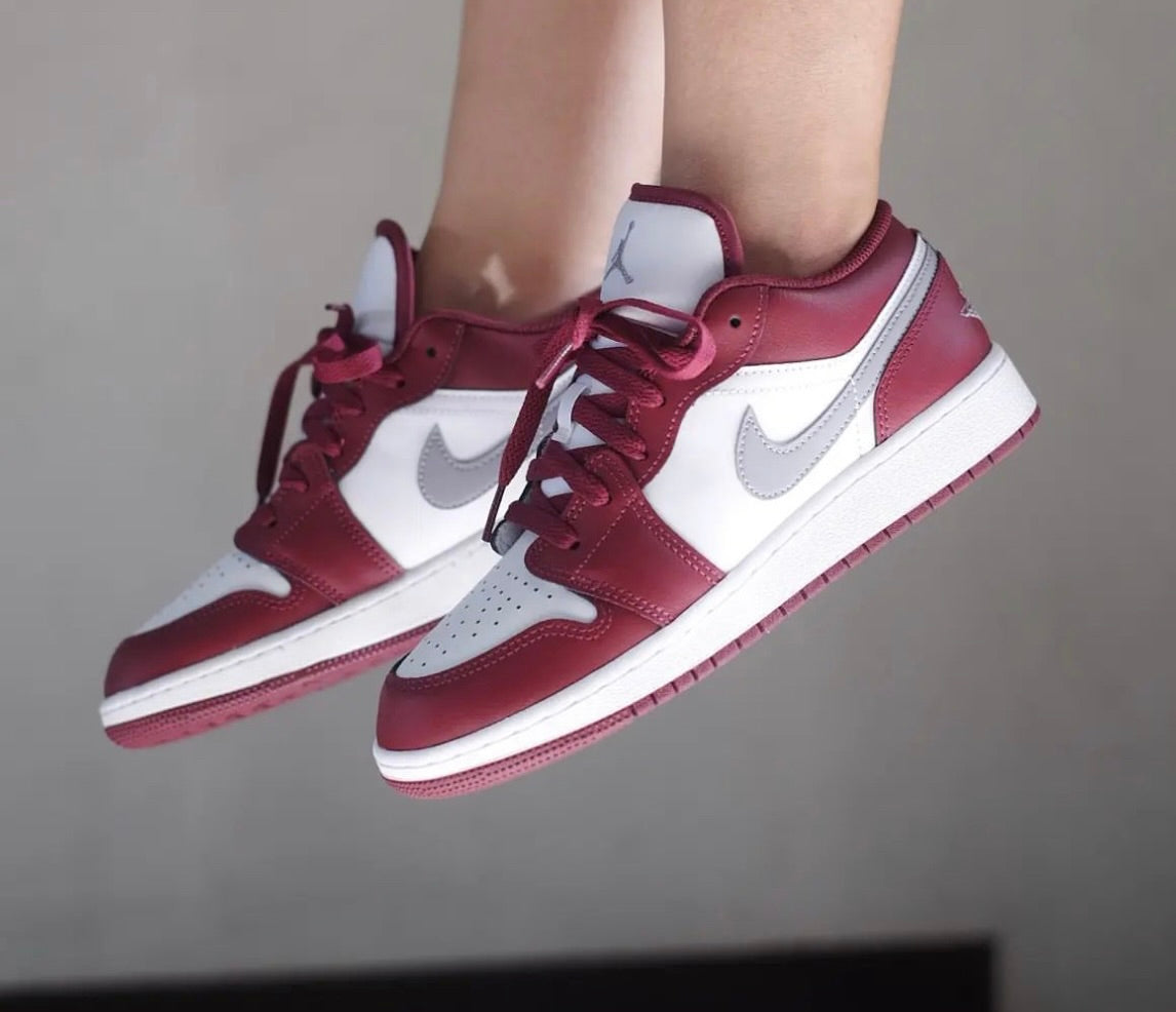 The AJ1 Low Bordeaux features a pure white upper with dark red overlays and perforations found at its forefoot. The white nylon tongue is embroidered with a metallic silver Jumpman logo. Other brand aspects include the mid-foot swooshes with a cherrywood red, matte look and printed wing motifs on the insoles.