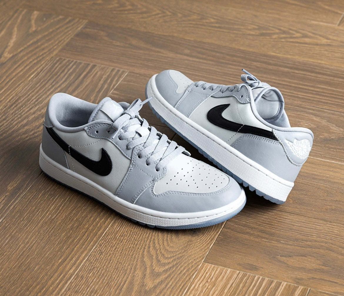 The AJ1 Golf 'Wolf Grey' comes with smooth leather panels, showing dark grey on the toe, front panel, eyelet, and heel panel. The perforated toe box and mid-panel then switch to a light grey, offset nicely by the black swoosh. The darker grey returns for the laces and tongue, while the heel has a white wings logo.