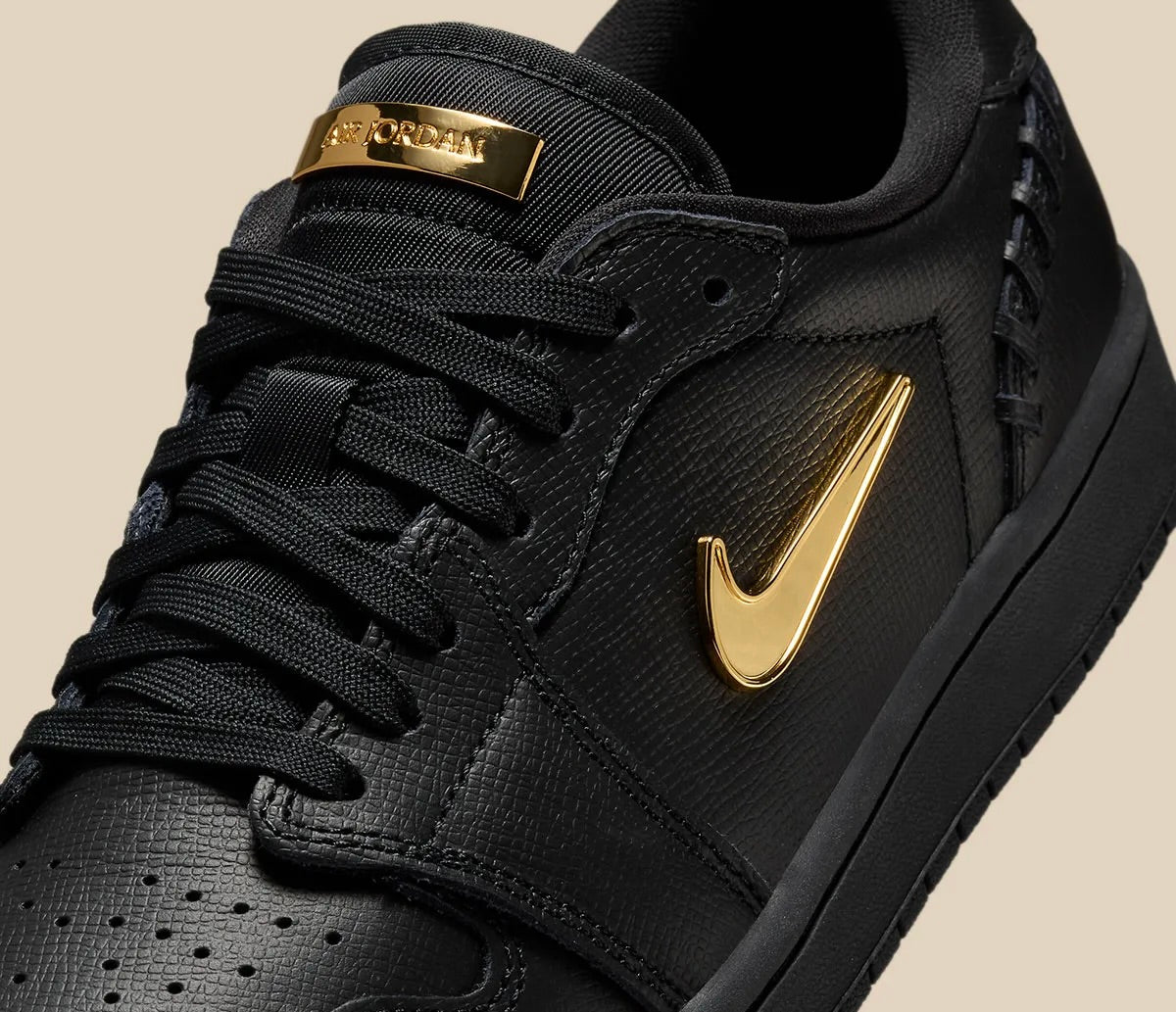 The AJ1 Low ‘Black Metallic Gold' sports an all black leather upper decorated with large stitched details on the forefoot and heel. A metallic gold swoosh embellishes the quarter panel, matching the molded wings logo on the heel tab and an 'Air Jordan' signoff on the tongue. A pink rubber cupsole houses an Air-sole heel unit for a plush feel underfoot.