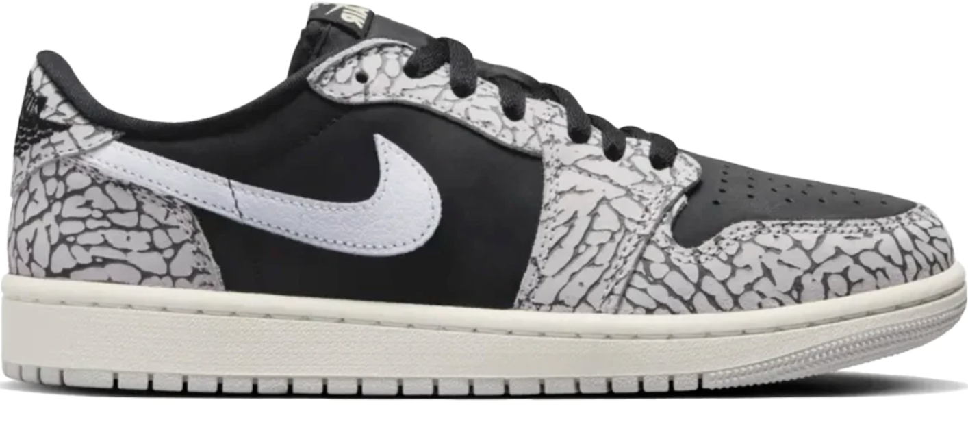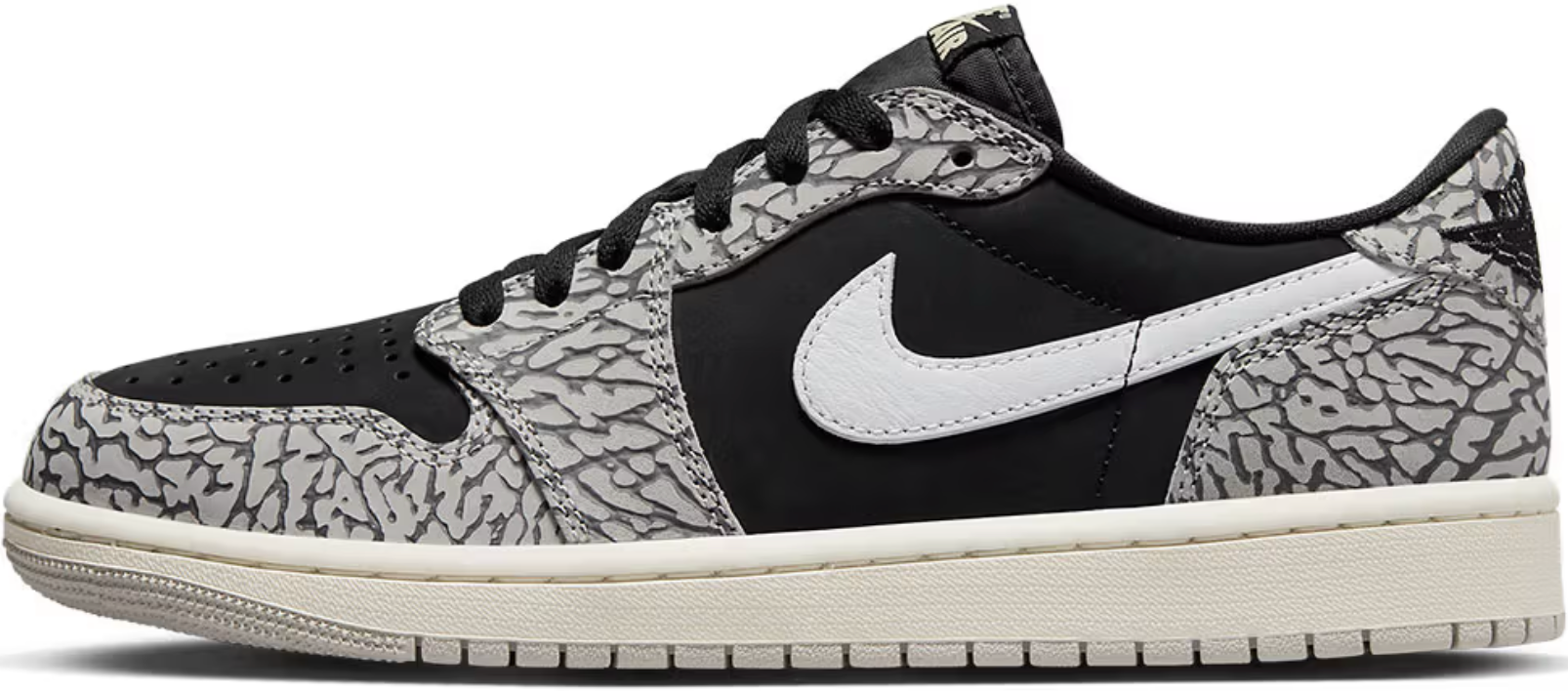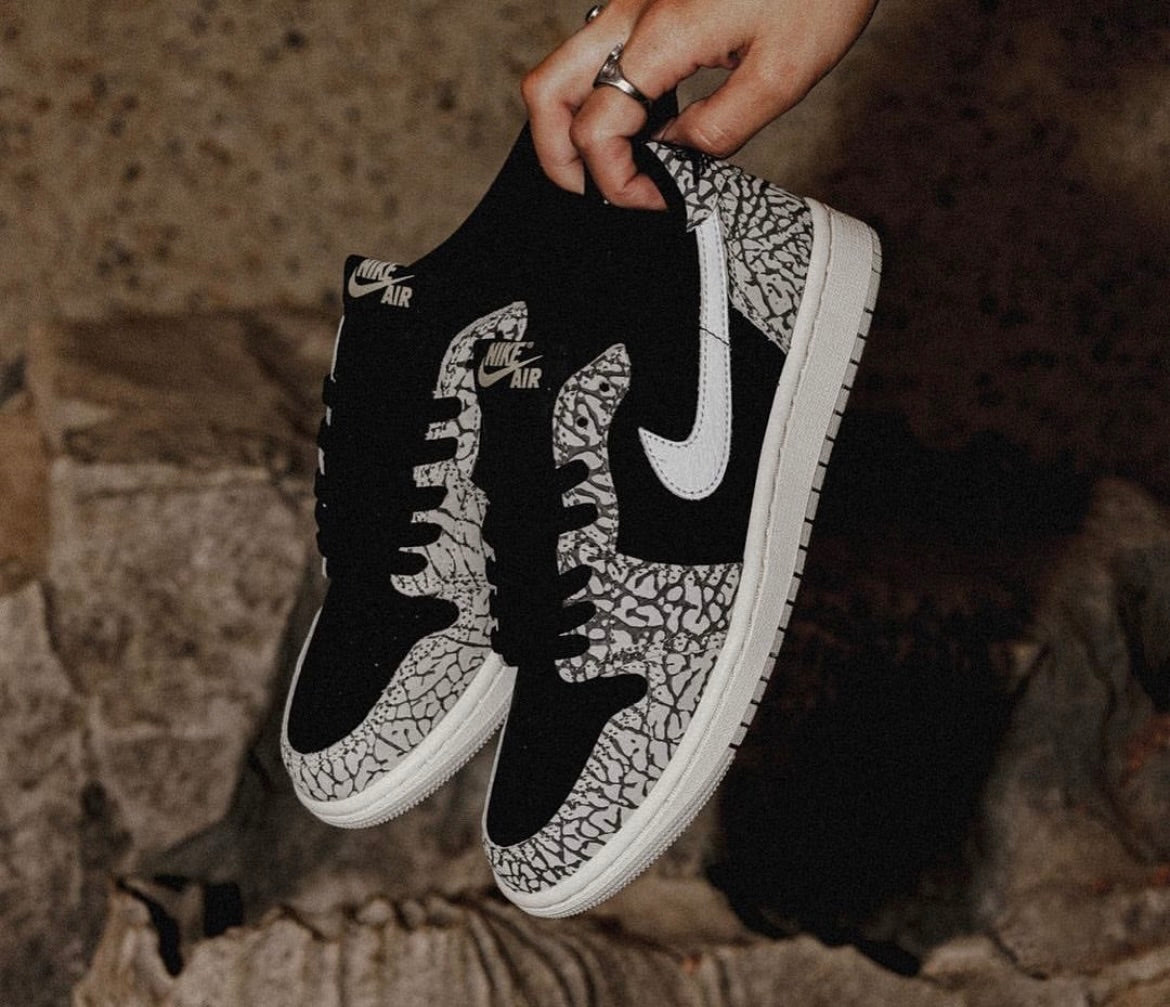 The AJ1 Low ‘Black Cement’ borrows an instantly recognisable design from the AJ3. Grey elephant print appears on the forefoot and heel overlays, while the rest of the upper is constructed from black nubuck. Branding elements include a white leather swoosh, Nike Air tongue tags, and a retro wings logo embroidered on the heel tab.