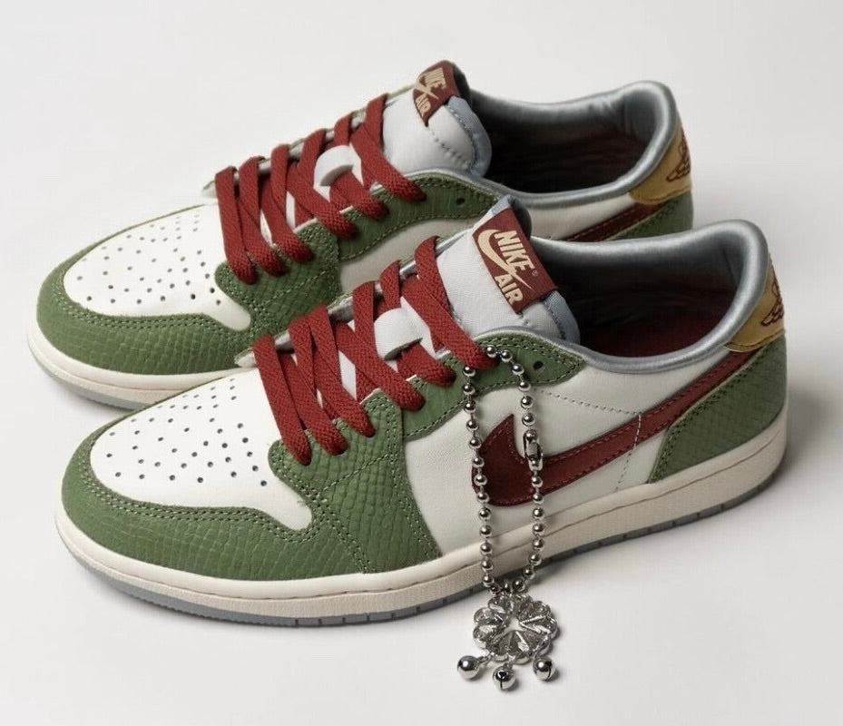 The AJ1 Low ‘Year of the Dragon’ features a white leather upper with scaly green overlays at the forefoot and heel. Crimson settles on the laces, tongue, swoosh, and wings logo atop the golden textile back tab. The interior tongue tag displays a Jumpman intertwined with a dragon, while an ornate Jumpman logo decorates the sockliner.
