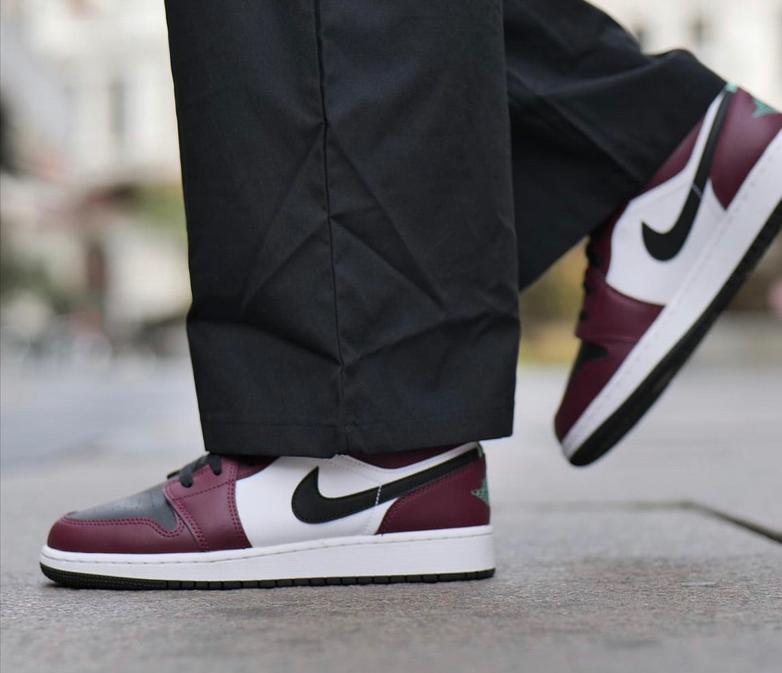 The AJ1 Low 'Dark Beetroot' adds a splash of bright green to a crisp beetroot style. A white leather base sees burgundy overlays to start off the fall-ready look. The tongue, toe box, and profile swooshes take a darker turn but going pitch black. A vivid green is seen on the logo, tongue and on the heel tab.