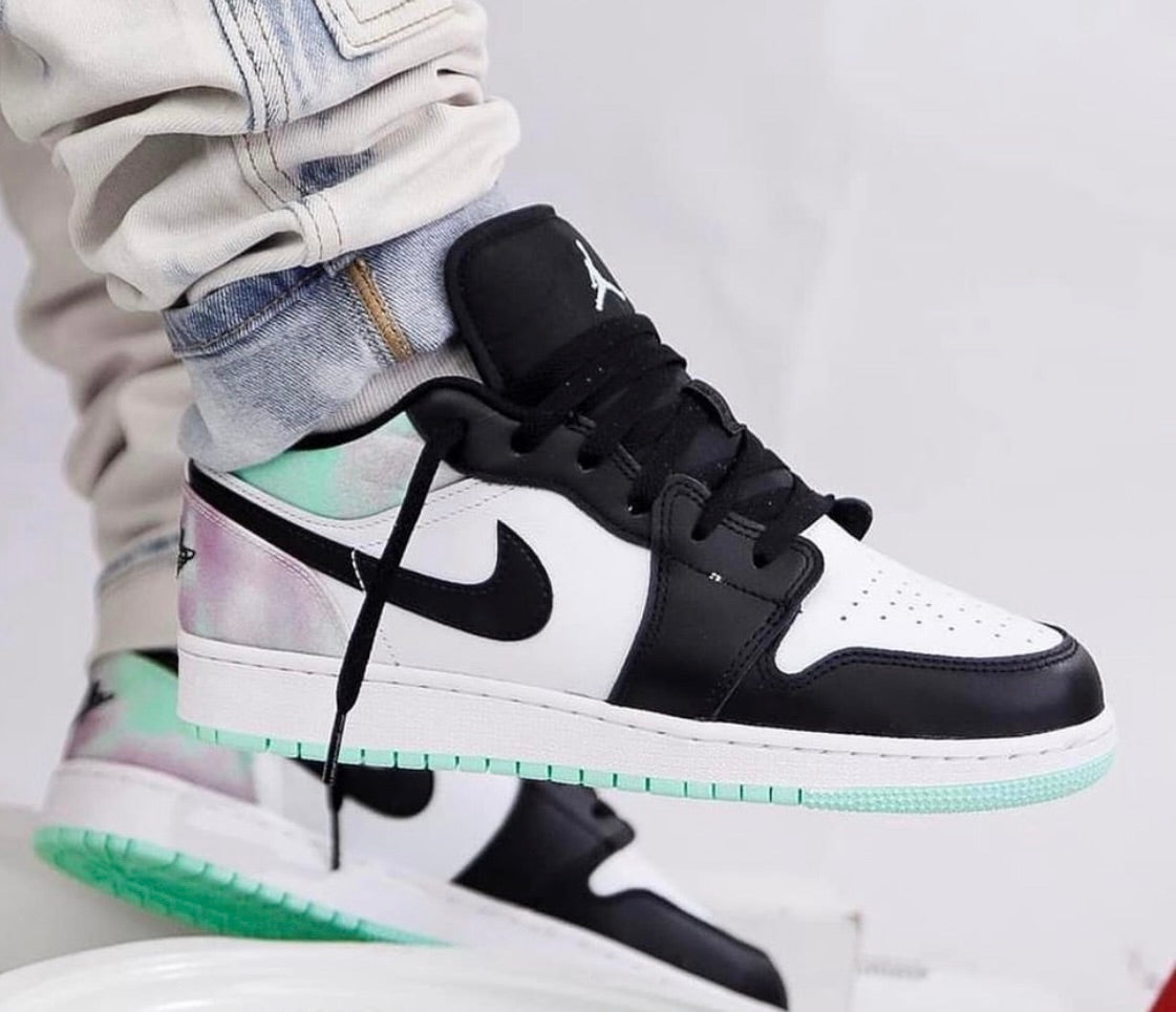 A favourite from 85' is treated to a tie-dye palette with the AJ1 Low 'Tie Dye'. Black toe colour blocking forms the backdrop, with a white base and overlays at the forefoot and swoosh in black. The heel reveals a tie-die pattern that alternates from aqua on the left to lavender on the right, both accompanied by wings logo.