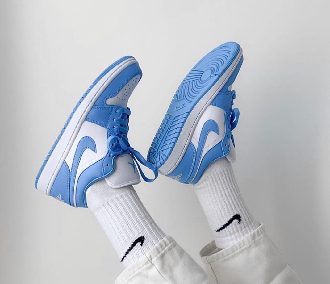 The AJ1 Low ‘UNC’ features a two-tone colour scheme that pays homage to MJ’s alma mater. The leather upper applies blue overlays on a white base, complete with a padded collar for comfort and perforated detailing for added breathability. Branding includes a Jumpman logo on the tongue, as well as the wings logo on the heel.