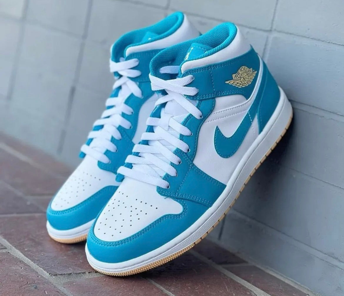 The AJ1 Mid 'Aquatone' features a white leather base with aquatone teal leather overlays on the toe cap, mudguard, eye-stay panel, collar flaps and heel counter. The signature swooshes on the quarter panels also follow suit. Gold joins the mix on the teal tongues and the embossed wings logos on the lateral collar flaps.