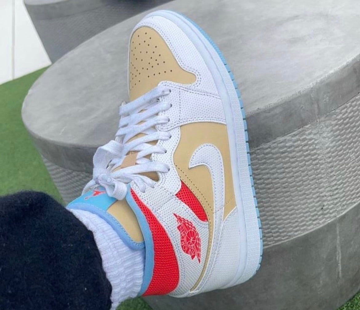 The AJ1 Mid 'Sesame' provides premium, white panelling and a white swoosh, which is contrasted perfectly by beige underlays. There are also pops of red on the ankle collar, whilst the wings logo also features in red. Finally, a pastel blue hue is used for the sock liner and features on the sole unit bringing the whole design together.