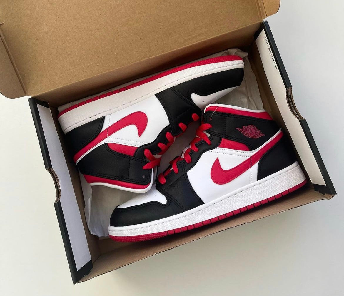 The upper of the AJ1 Mid 'Very Berry' has white across the toe box and across the main mid-panel. Its then paired with black leather around the toe, across the side panels, up the eyelet strip, along the ankle, and around the heel tab. This is complemented by red across the collar panel and on the wings logo.