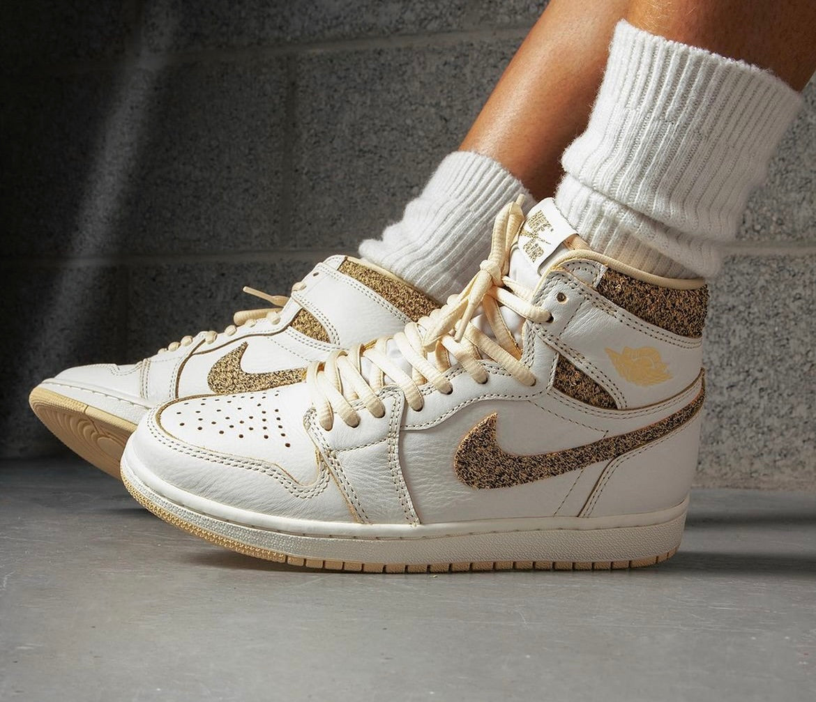 The AJ1 ‘Vibrations of Naija’ presents with off-white leather on the upper, accented with a vanilla swoosh with black speckling. The identical finish is applied to the collar with a wings logo on the lateral side. A Nike tag embellishes the breathable nylon tongue. Its mounted on a rubber cupsole, featuring a cream-coloured outsole.
