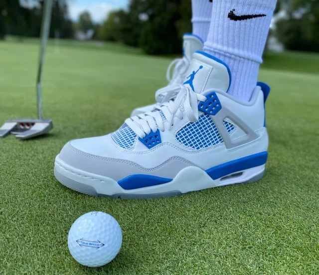 The AJ4 Golf 'Military Blue' is a performance golf shoe, built with leather, its upper includes blue accents, including below the netting that marks the quarter panel and vamp. The forefoot overlay and structural wings add grey to the look, while underfoot, removable spikes on the outsole plate are included for traction.
