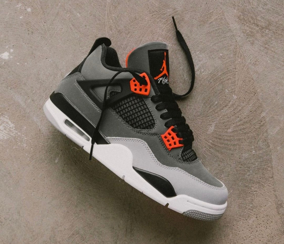 Bringing back colour blocking similar of the 'Green Glow' AJ4, is the AJ4 'Infrared'. The upper is made from smooth nubuck in a charcoal finish. A lighter shade of grey is on the forefoot, with black accents on the quarter panel netting, wings, and heel tab. The titular hue lights up the woven tongue tag and molded eyelets.