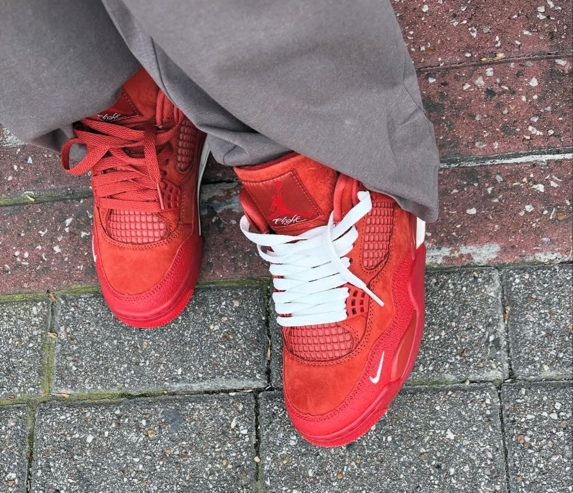 The AJ4 x Nigel Sylvester 'Brick By Brick' delivers a suede upper, finished in firewood orange. It features heritage details, including quarter panel netting, molded eyelets and TPU wings. It is disrupted by discreet off-white accents, including on the flight logo on the tongue tag and on the embroidered mini-swoosh. Bike air branding hits the heel tab.