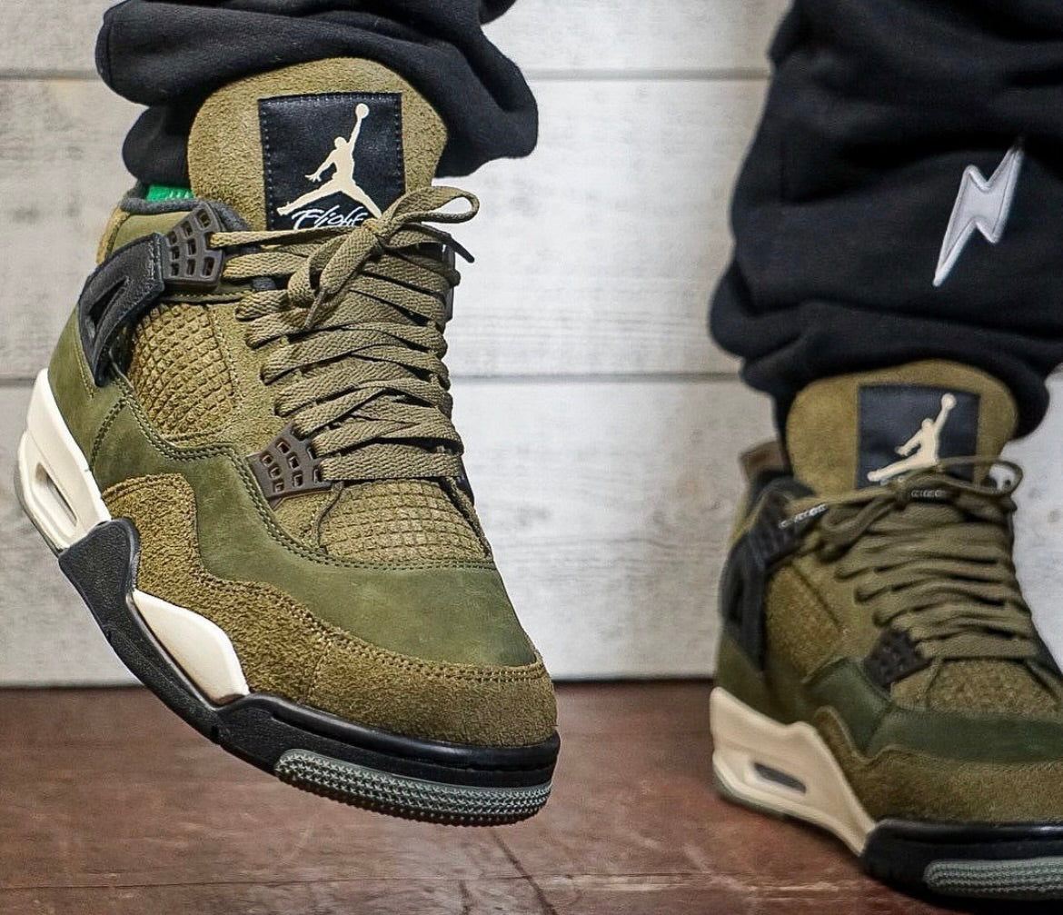 The AJ4 ‘Olive’ showcases a nubuck and suede upper in varying shades of green. Suede quarter panels feature a debossed grid-like pattern, replacing the traditional midfoot netting of the original AJ4. Black accents settle on the leather support wings, molded eyelets and tongue tag, marked with flight branding and a cream-hued AJ logo.