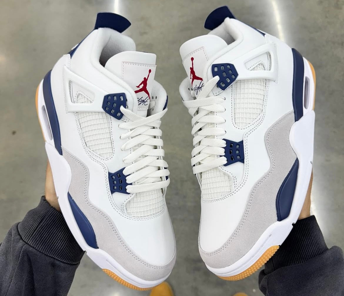 The Nike SB x AJ4 ‘Navy’ features a white upper with a grey suede forefoot overlay and quarter panel netting. A crimson logo adorns the tongue tag, while Nike SB branding hits the navy heel tab. Additional navy accents make their way to the molded eyelets and polyurethane midsole, discarding the air-sole unit in the but leaving the air bag in the heel.