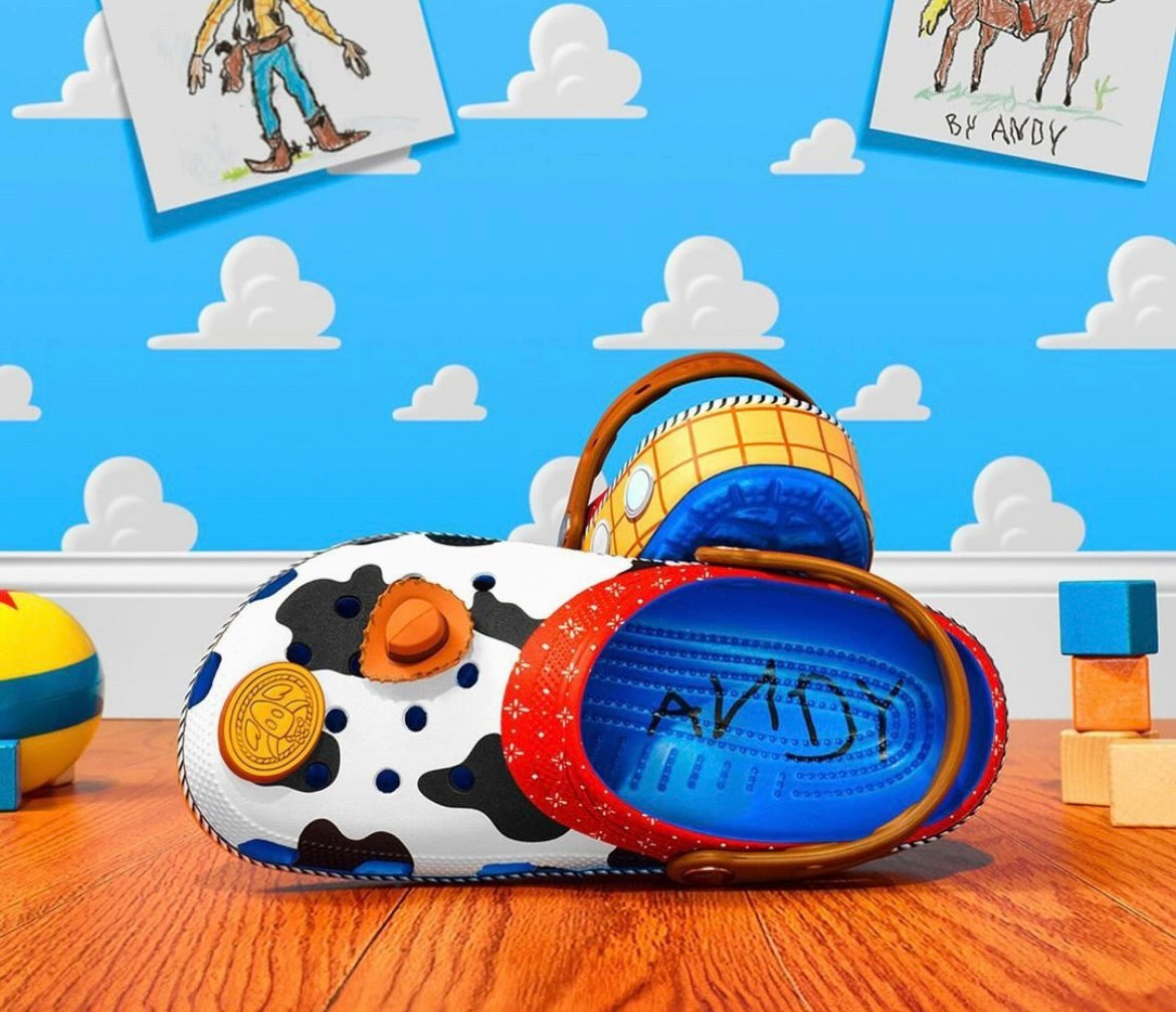 Following the effective formula of adding each character’s unique colours, patterns, and personality traits on the Classic Clog, the two protagonists emerge on the globally popular rubber shoe. Woody’s pair feature cow-skin print at the toe, with a red bandana like pattern, brown at the heel strap, and plaid pattern/buttons at the midsole.