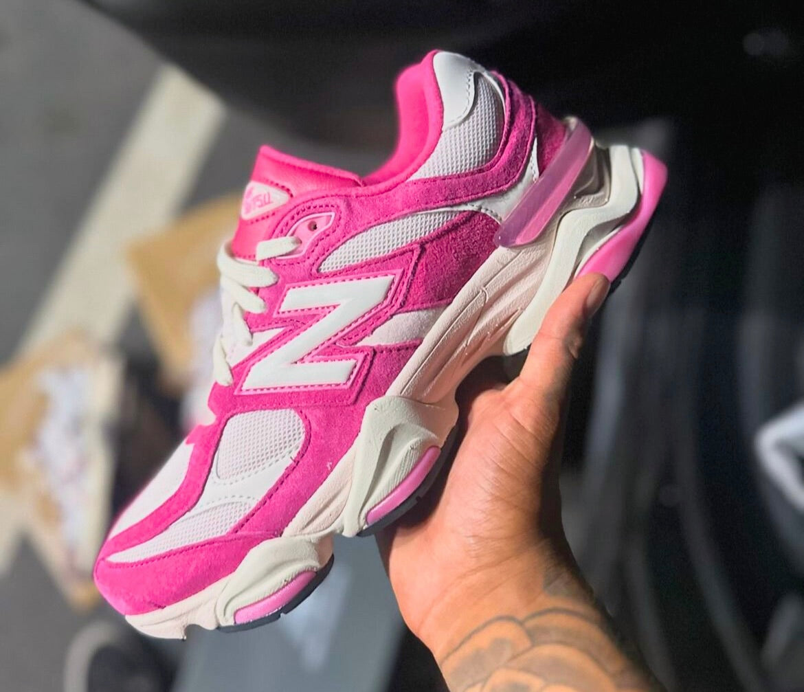 The NB9060 'Pink Fuchsia' features a half-and-half split between pure white & fuschia, with the pink shade hitting the overlays and anchoring down the sockliner and tongue sections. Underneath, the snowy mesh and leather underlays ensures that despite the eye-catching pink overtones, you won’t have any issues styling them into everyday outfits.