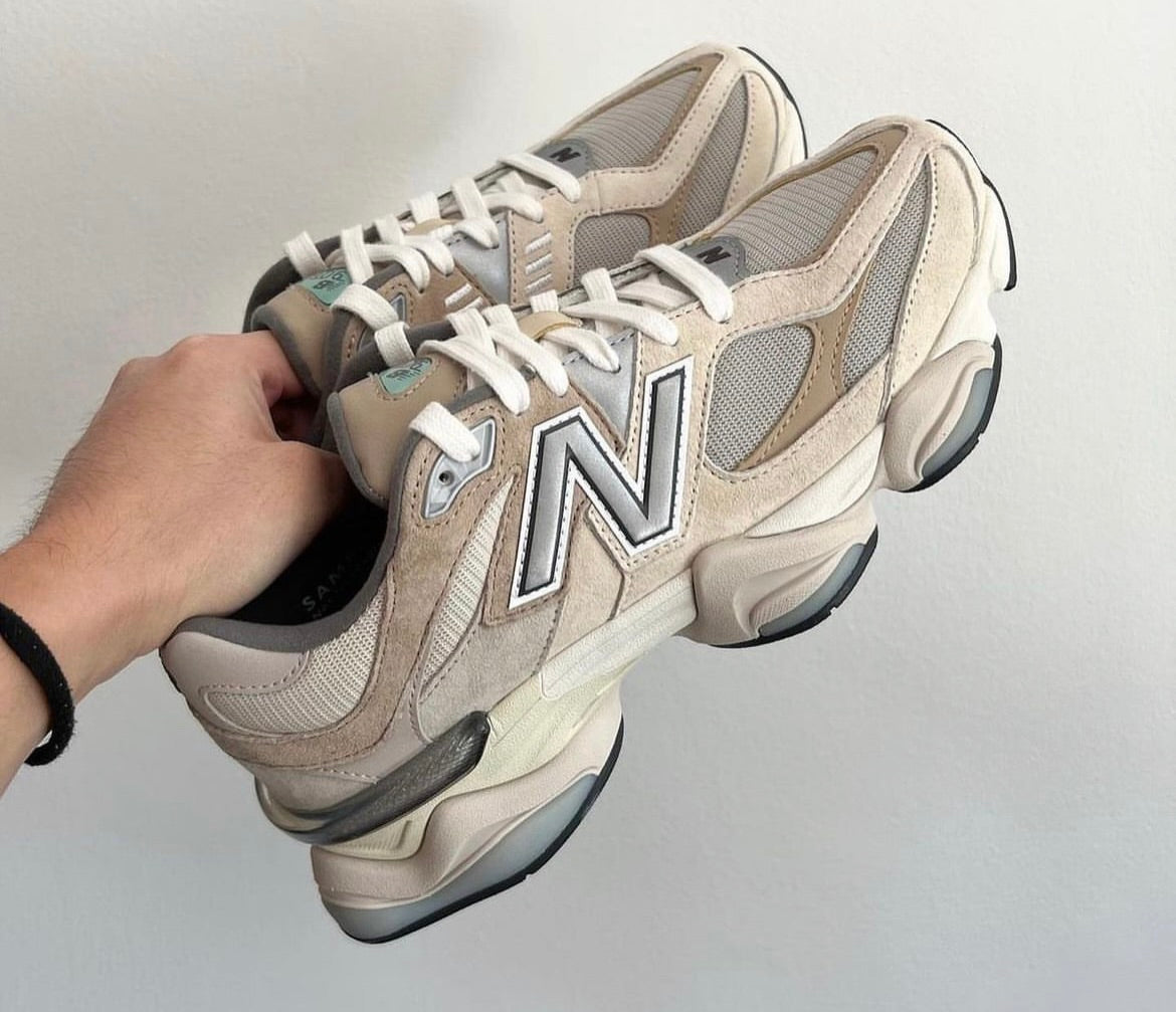 The NB9060 ‘Sea Salt Surf’ showcases neutral tones, with an upper that combines sand-coloured mesh with tonal suede overlays. Atop the tongue, a NB9060 logo is inspired by the original 991 lace jewel. It rides on a sculpted ABZORB midsole, enhanced with SBS cushioning and a translucent CR device at the heel.