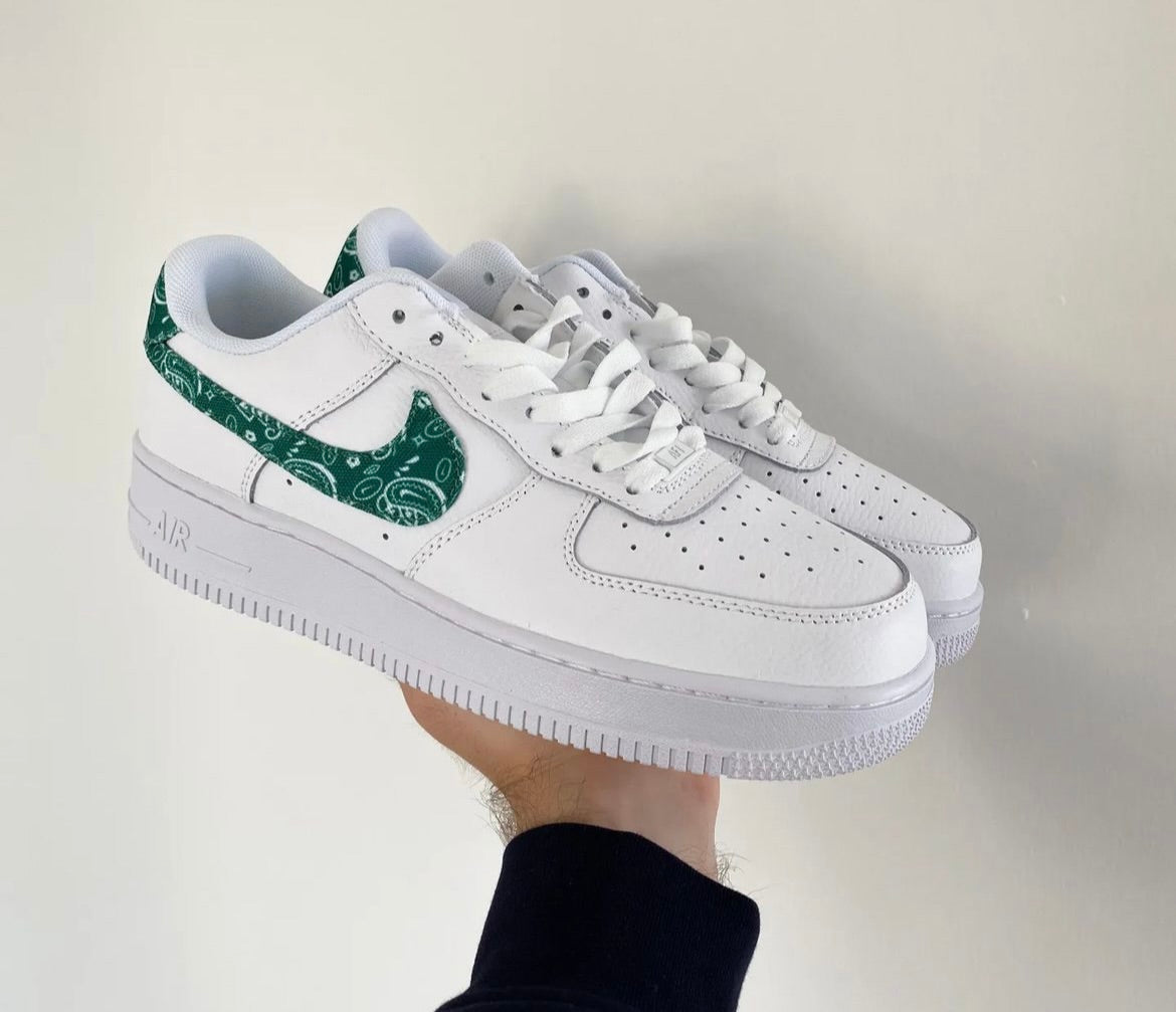 Accentuated with a paisley twist, the AF1 Low 'Green Paisley' subtly animates the iconic AF1 silhouette. With its pebbled white leather base and matching air-cushioned midsole, this classic boasts a well-loved clean colourway. Its elevated with its twill green paisley-patterned swoosh and branded heel tab.