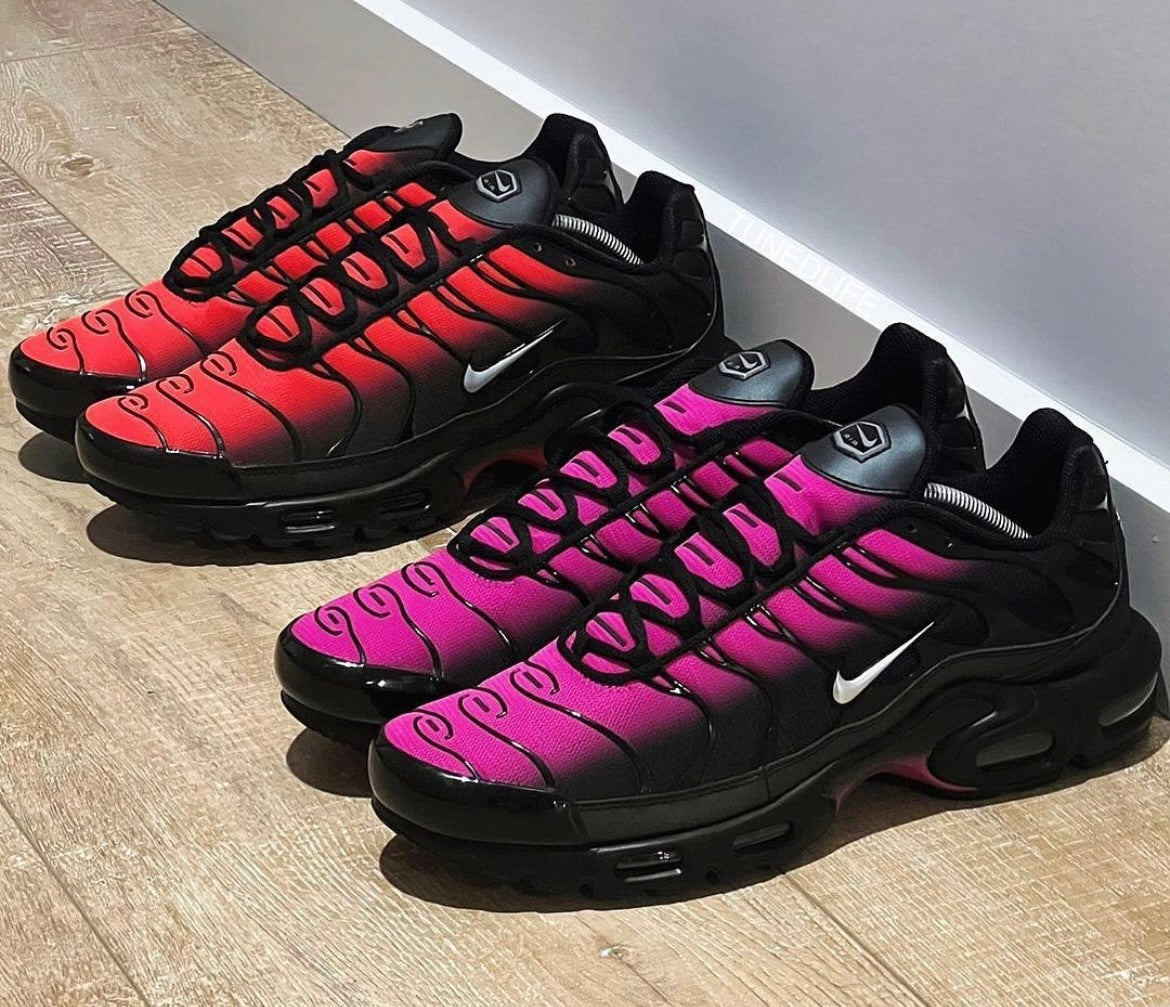 The Nike AM Plus 'Pink Sunset' showcases a blacked out base layer accentuated with pops of pink for a striking combination. The upper is made with a curved overlay in rubber, which is black from the front to the mid-heel. Its features black laces, with pink fabric eyestay accessories, a black tongue and pink at the collar.