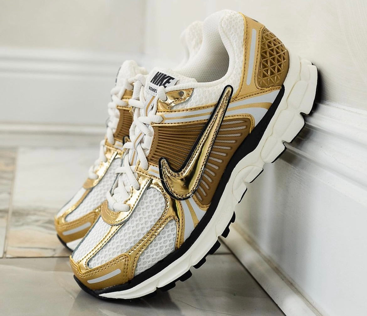 The Vomero 5 'Metallic Gold' is built with white mesh and durable synthetic leather overlays in metallic gold. That gold hue makes appearances on the swoosh and heel counter. A subtle off-white finish is applied to the midsole, enhanced with zoom air in the forefoot and heel. Its rubber outsole utilises a classic waffle tread for durable traction.