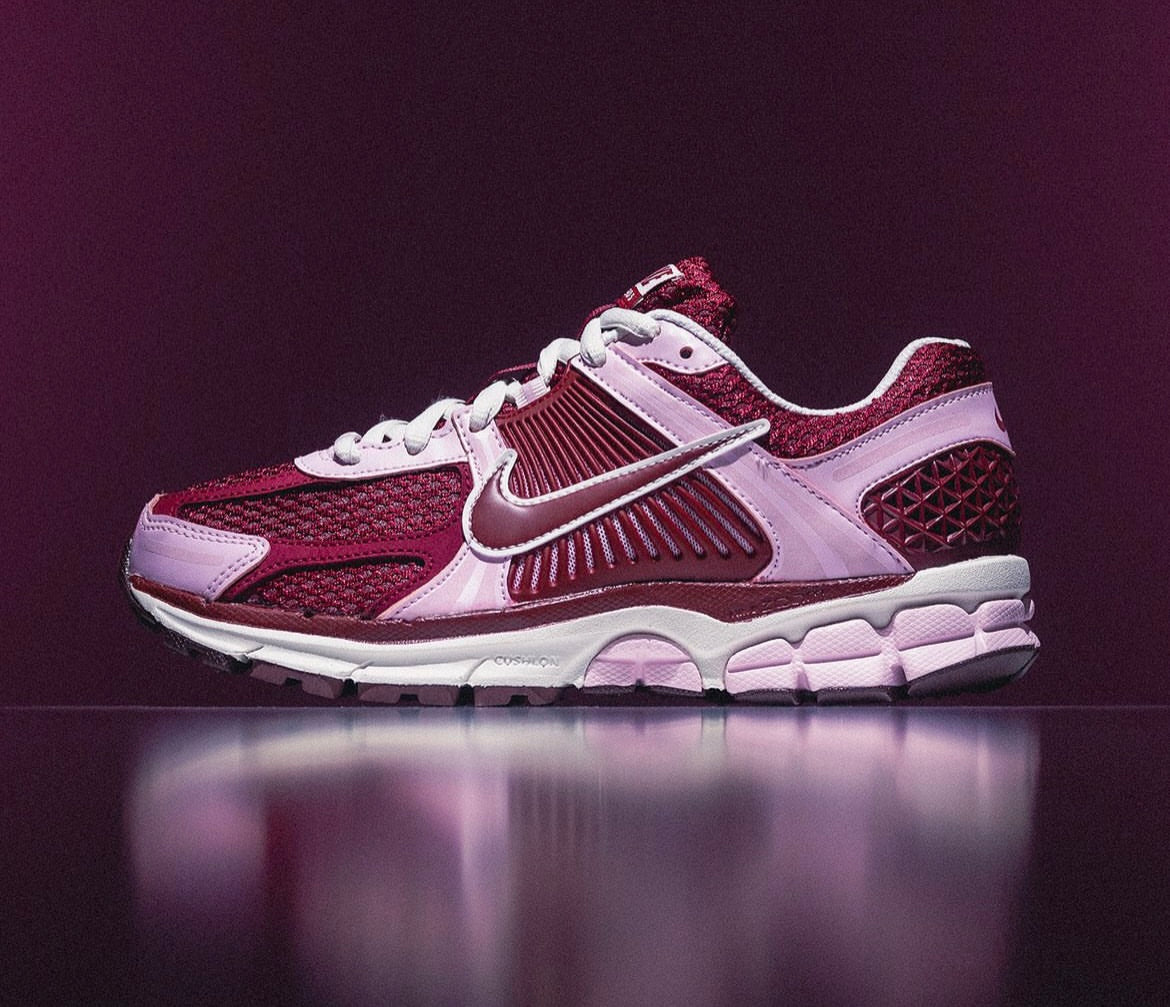 The Nike Vomero ‘Pink Foam’ features an upper that combines airy maroon-coloured mesh with durable synthetic leather overlays in a pastel pink hue. The quarter panel features a TPU cage, while a molded heel counter provides rearfoot stability. Anchoring is a foam midsole with encapsulated Zoom Air cushioning for improved energy return.