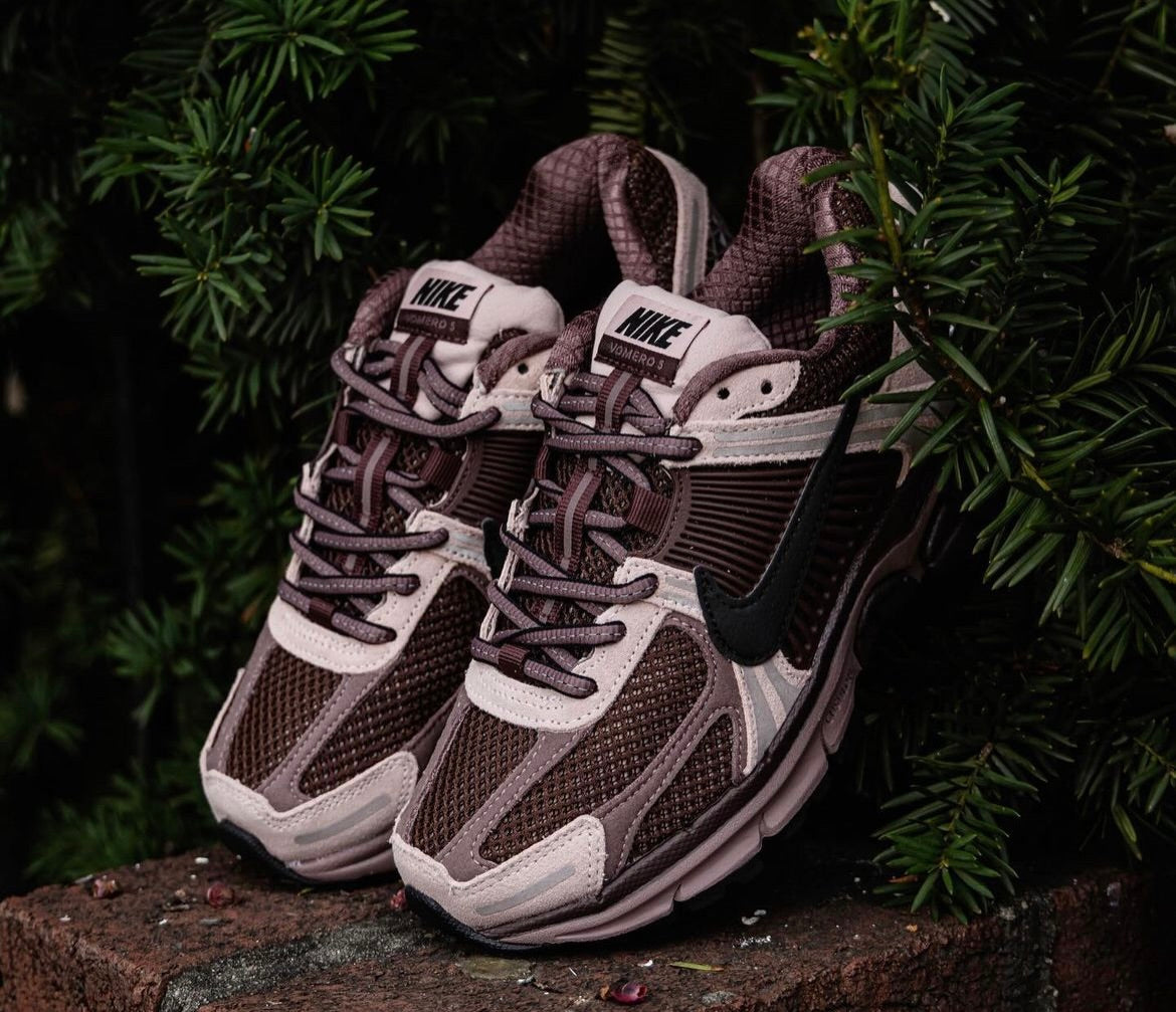 The Vomero 5 ‘Plum Eclipse’ blends muted hues with a texturally layered build. The upper features mesh in dark plum, contrasted by pink with reflective detailing. A black swoosh lays atop the midfoot, while the tongue displays Nike Vomero branding. It then sits atop a lightweight midsole with Zoom Air units in the forefoot and heel.
