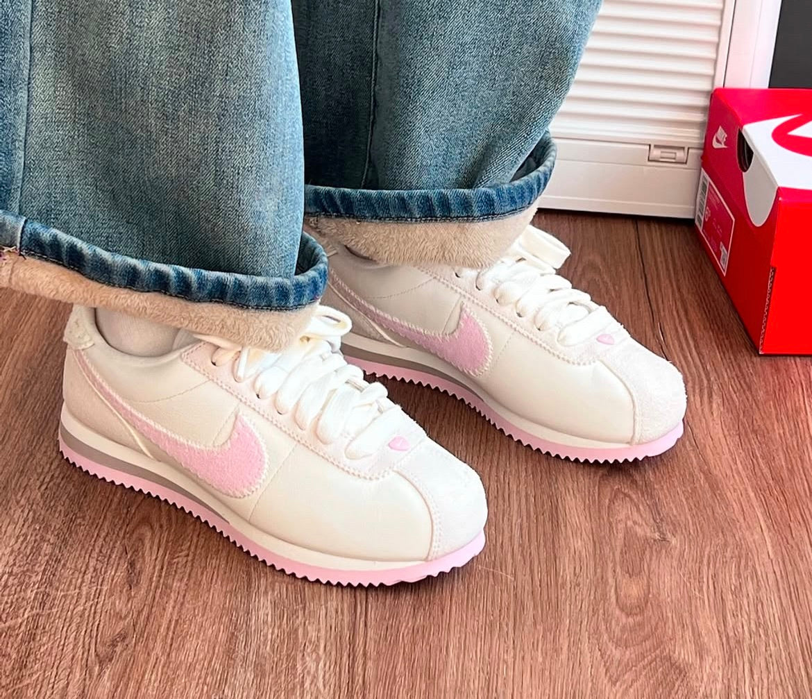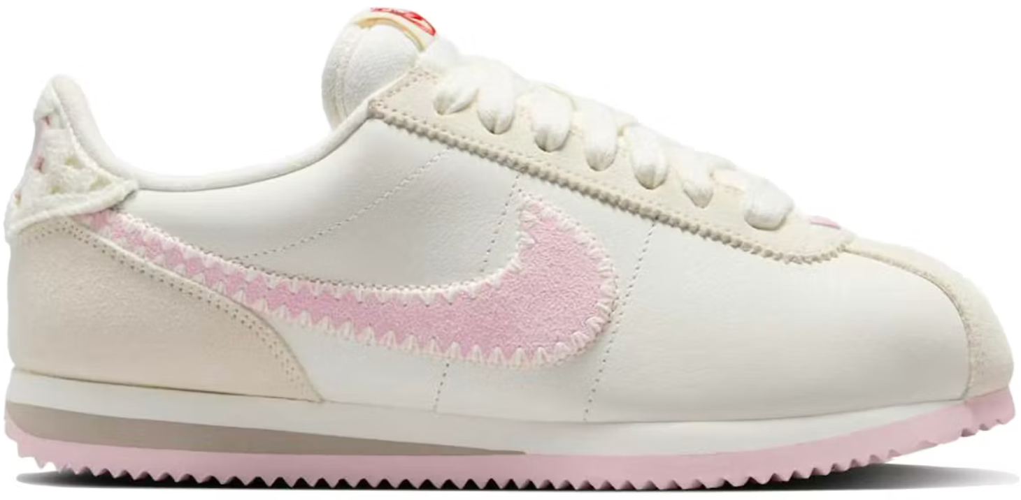 The Nike Cortez 'Valentine's Day' carries a sail-coloured leather upper with tonal suede at the forefoot and heel. Exposed deco stitching surrounds a pink suede swoosh, while the crocheted back tab features an embroidered pink heart marked with a mini-swoosh. Atop the tongue, a woven tag displays a heart-shaped cherry graphic.