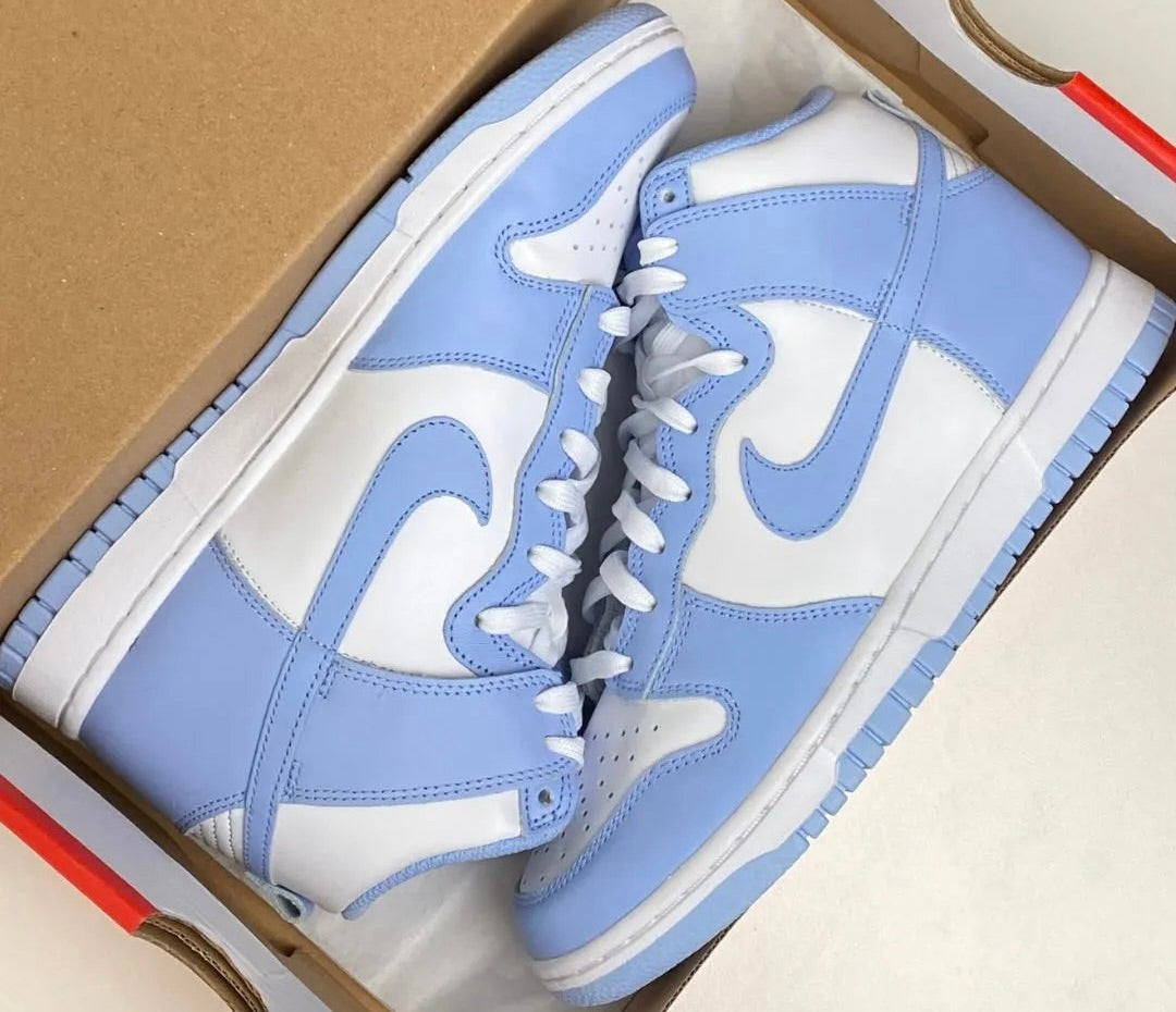 The Dunk High ‘Aluminum’ takes inspiration from MJ’s alma mater, the University of North Carolina, with a similarly minded two-tone colour palette. The white leather upper features aluminium overlays across the swoosh, toe box and collar. It continues through to the light blue tongue branding and the same colour-blocked sole unit.