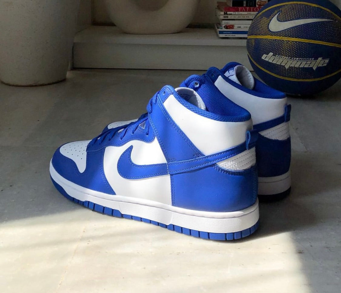 The Dunk High 'Game Royal' brings in shades of white and blue, with a leather panel that overlaps stitches across the classic swoosh, both shown in bold blue. The royal blue of this sneaker stands out against the white leather panels and is complete with blue laces and blue sole, all in the same corresponding shade.