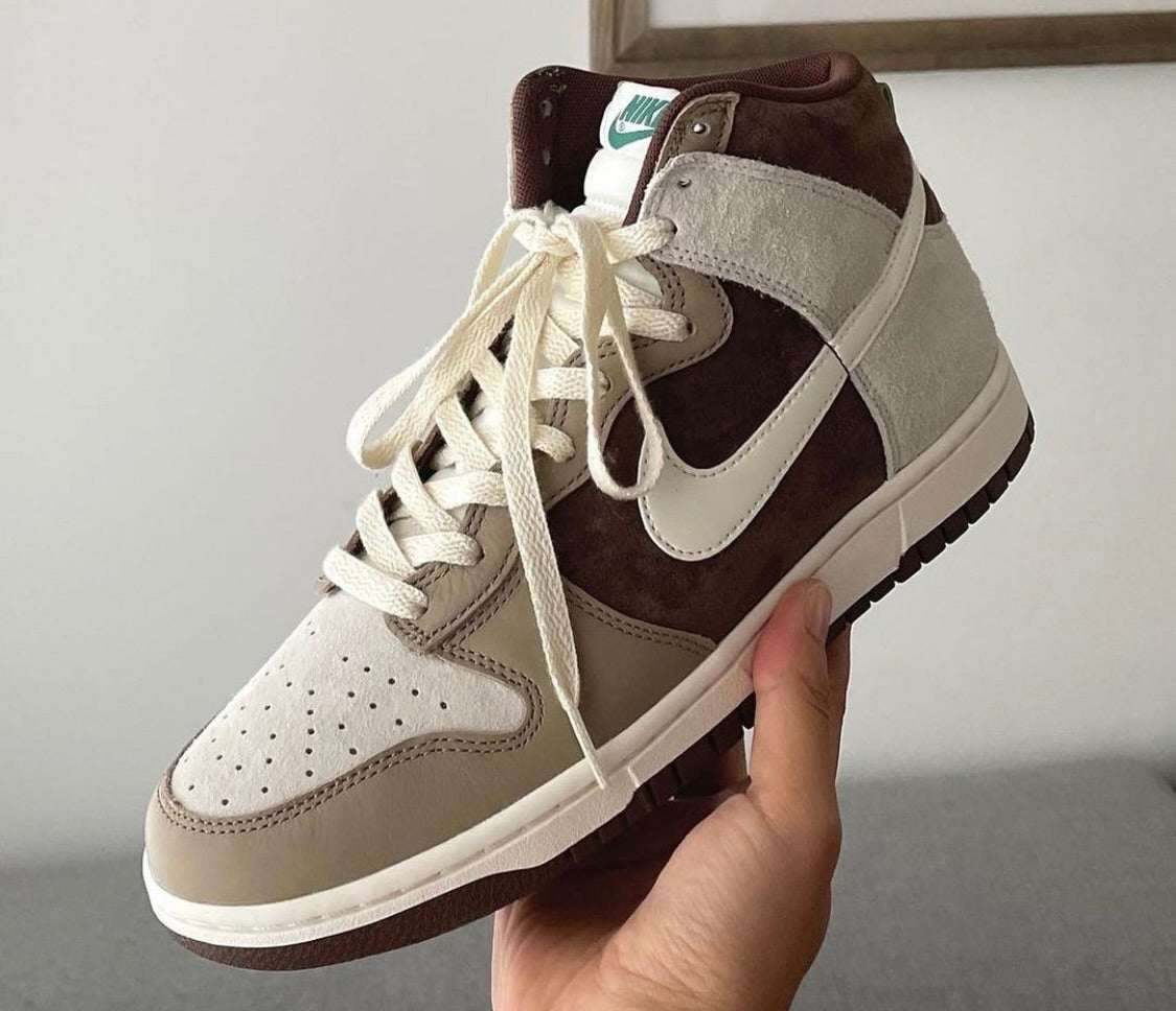 The Dunk High 'Chocolate' gives an earth tone to the iconic shoe. The upper mixes a brown suede base with forefoot and heel overlays in light brown leather and sail-coloured suede. A similar off-white hue is on the perforated toe box and swoosh. The bright green heel tab is paired with branding on the tongue tag and sockliner.