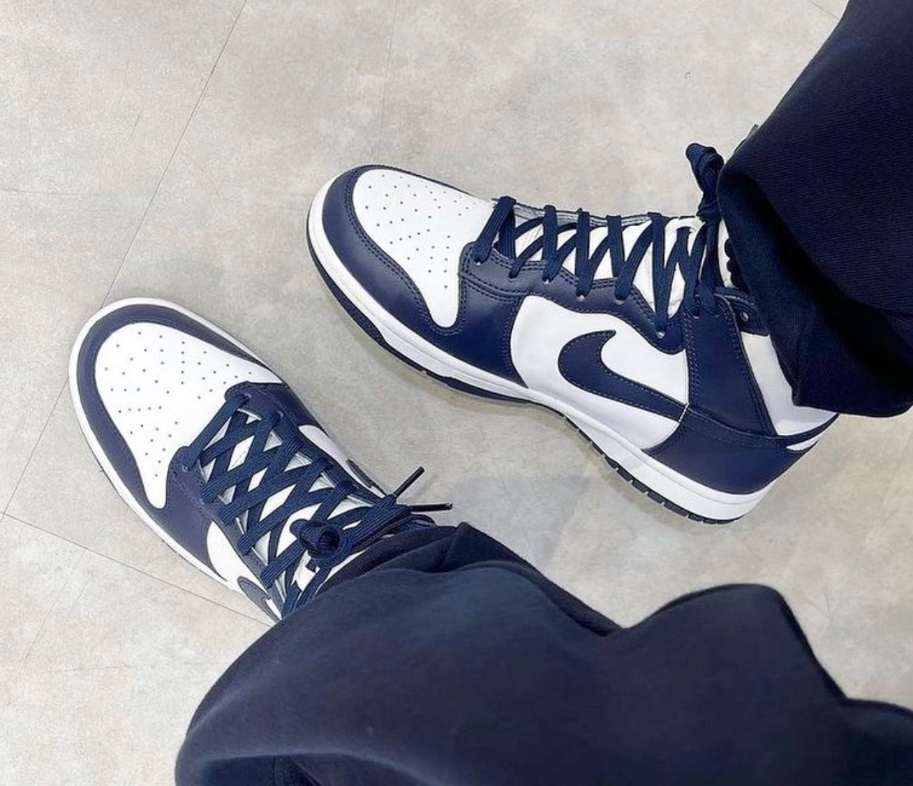 The Dunk High 'Midnight Navy', originally created for Villanova University, carries a leather upper that pairs a crisp white base with contrasting overlays in navy hue. Nike branding decorates the sockliner and a woven tag placed atop the lightly padded nylon tongue. It features a rubber cupsole with white sidewalls and navy outsole.