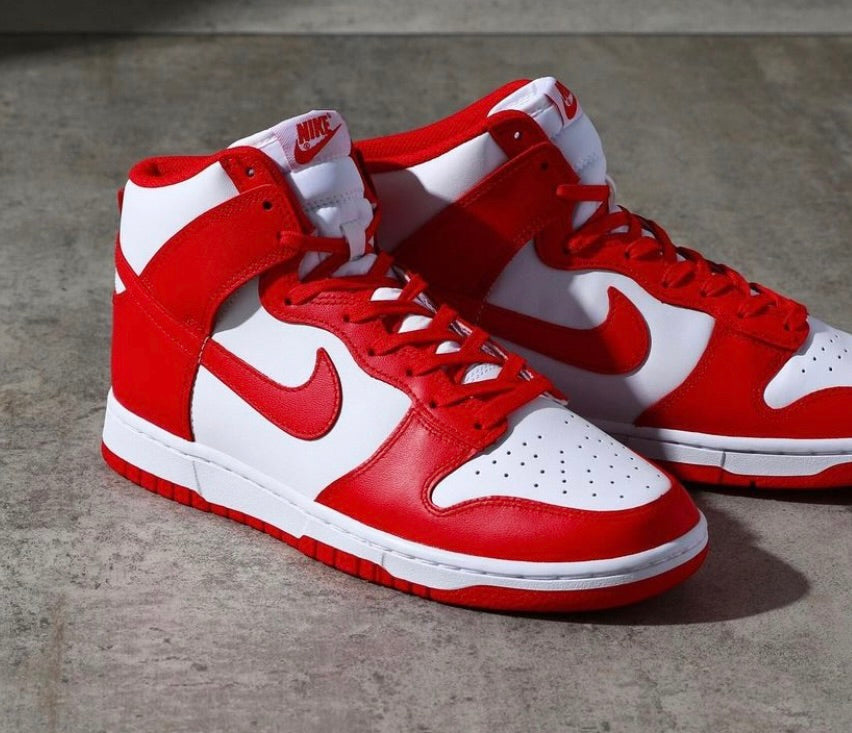The Dunk High ‘University Red’ showcases classic colour blocking that recalls the iconic ‘Be True to Your School’ series from '85. It carries an all-leather upper that pairs a crisp white base with red overlays at the forefoot and heel. The vibrant hue is repeated on the swoosh, branded tongue tag, and mesh collar lining.