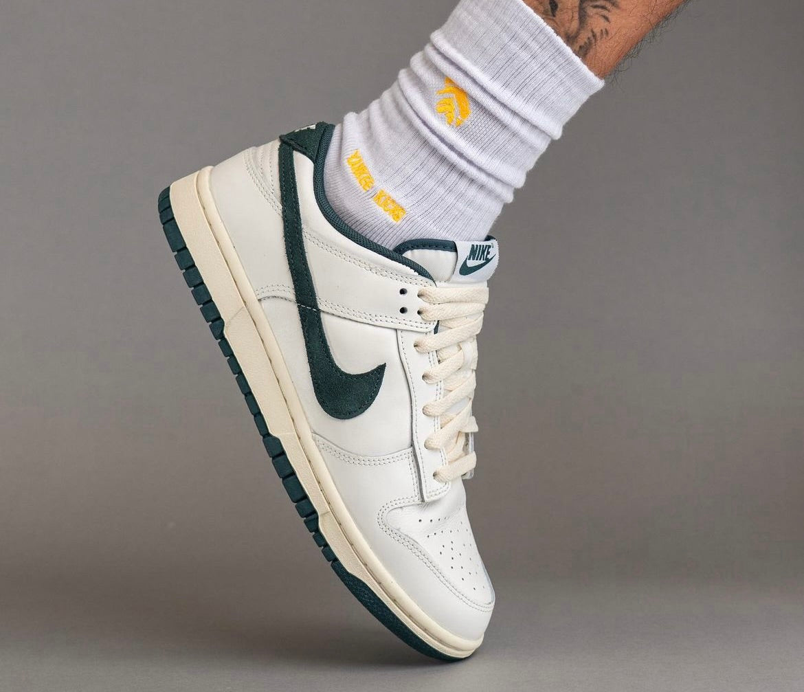 Launching as part of the ‘Athletic Department’ series, the Dunk Low ‘Deep Jungle’ features an ivory-hued leather upper with suede green accents on the Swoosh and Nike-branded tab at the heel. Nike tag graces the nylon tongue, while Athletic Dept. branding appears on the sockliner. A vintage off-white finish is applied to the midsole.