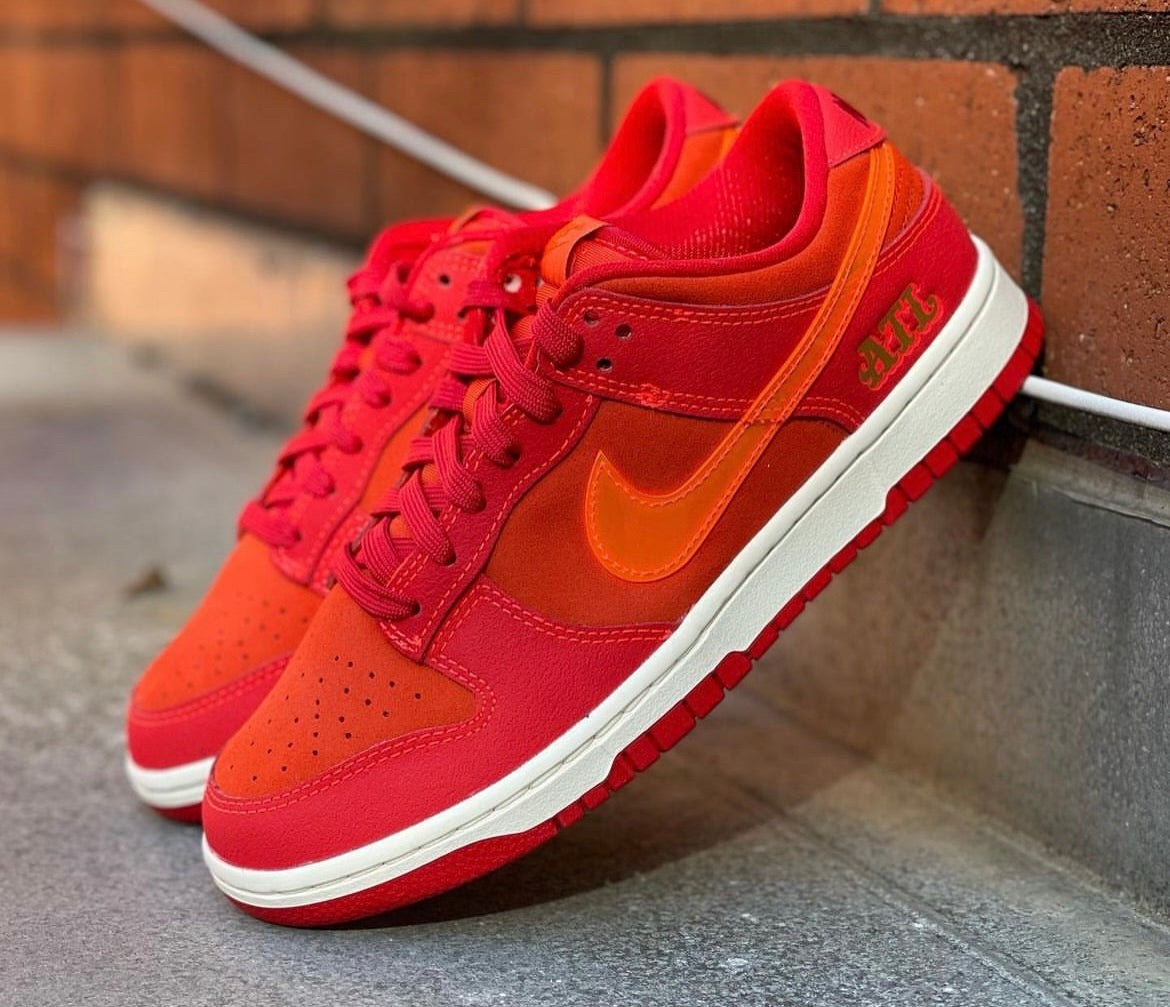 As part of Nike’s celebration of the 50th anniversary of hip-hop, the Dunk Low ‘ATL’ recognises the role of Atlanta in the genre. Reflecting the city’s pulsing music scene, it features a red suede upper with university red overlays and a translucent Crimson Swoosh. A custom ‘ATL’ graphic embellishes the lateral heel and sockliner.