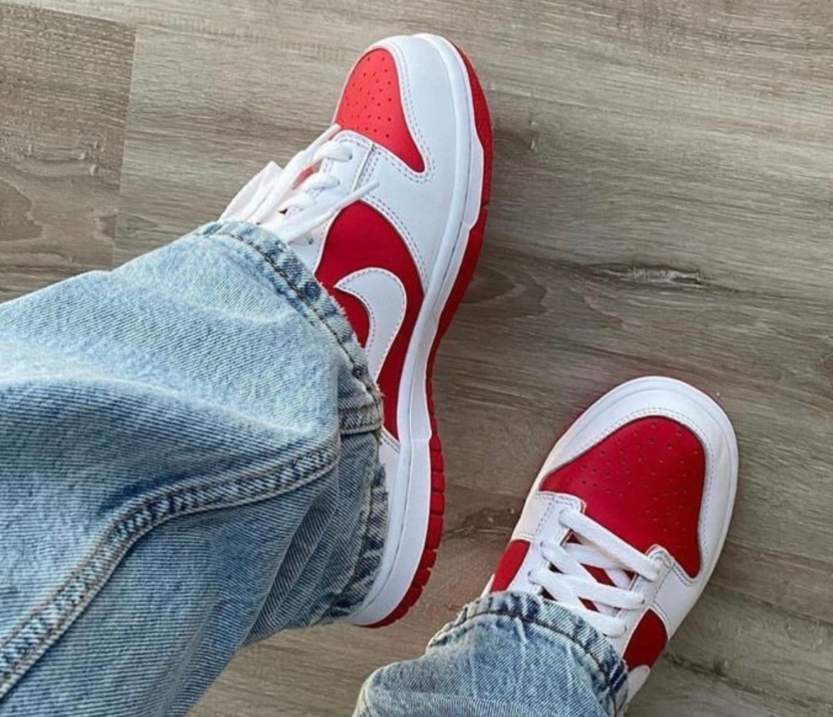 The Dunk Low 'Championship Red' adopts a varsity-inspired two-tone colour scheme. The upper pairs a bold scarlet base with contrasting overlays in a pristine white finish. Matching white land on the signature swoosh, woven tongue tag and laces. It's mounted on a white midsole and crimson rubber outsole, featuring a traction pattern.