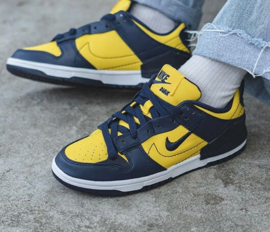 The Disrupt Dunk 'Michigan' sports a University of Michigan inspired colourway. The yellow leather base is complete with a perforated toe box and is decorated with contrasting navy leather overlays. An embroidered deep blue swoosh sits on the sidewall, whilst a stitched outline further decorates the detailed design.