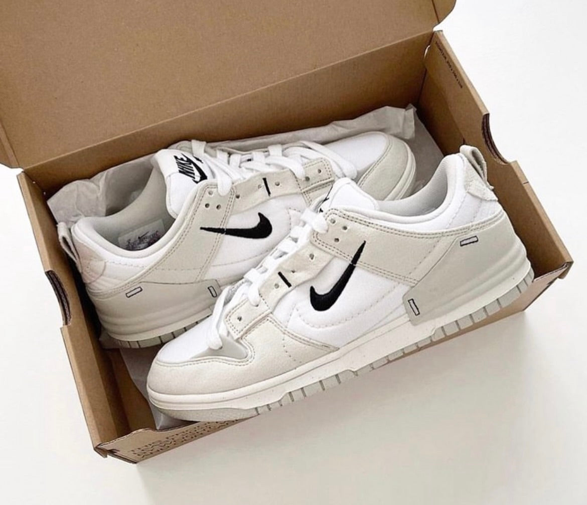 The Disrupt Dunk Low 'Pale Ivory Black' presents a modern, reconstructed take on the ‘80s hoop silhouette. Neutral tones are executed on the synthetic upper, featuring a white textile base with ivory suede overlays. Contributing to its the DIY aesthetic, are an appliqued heel counter and multiple lace-up options, highlighted by double eyestays.